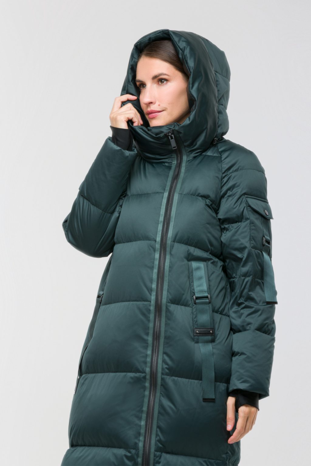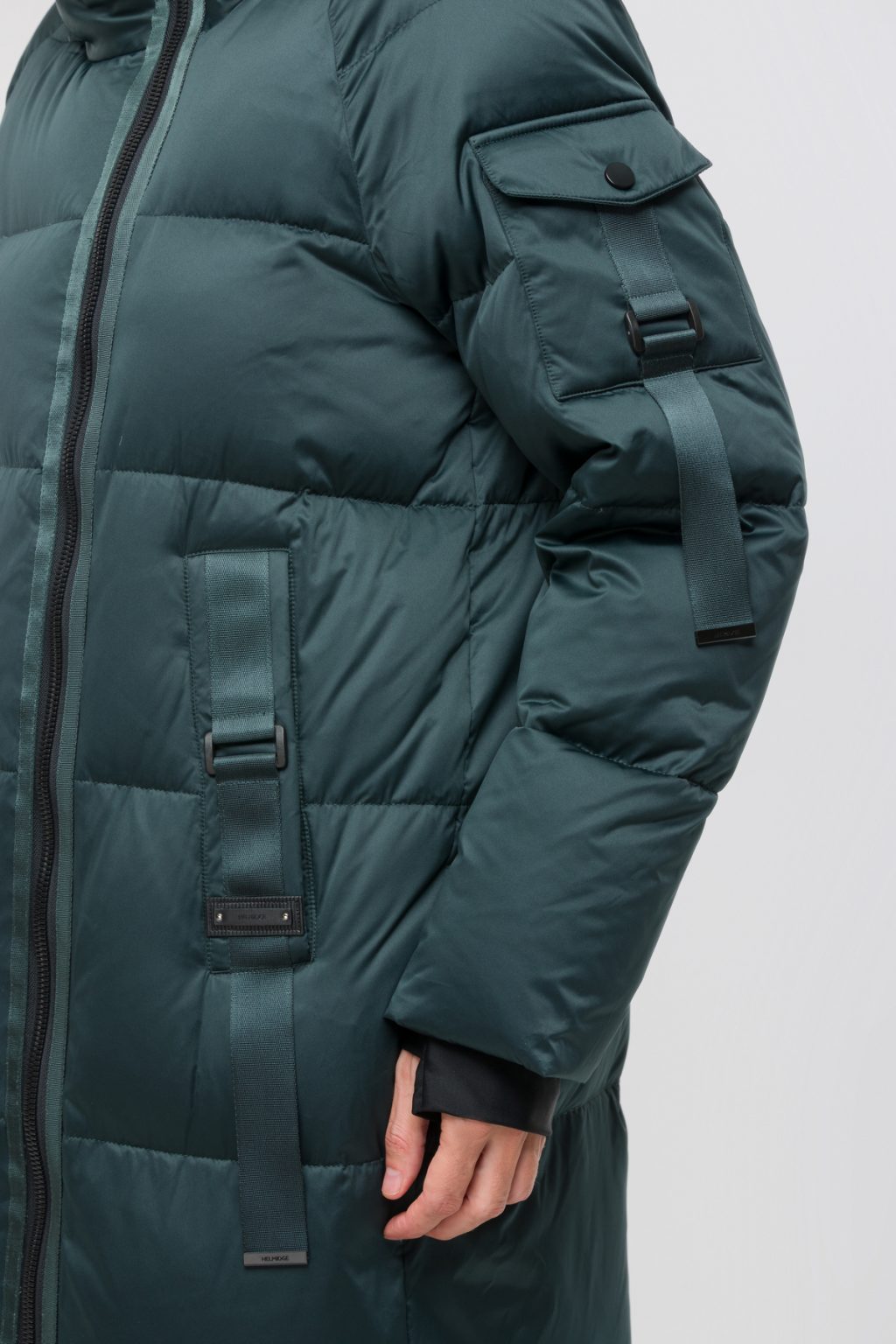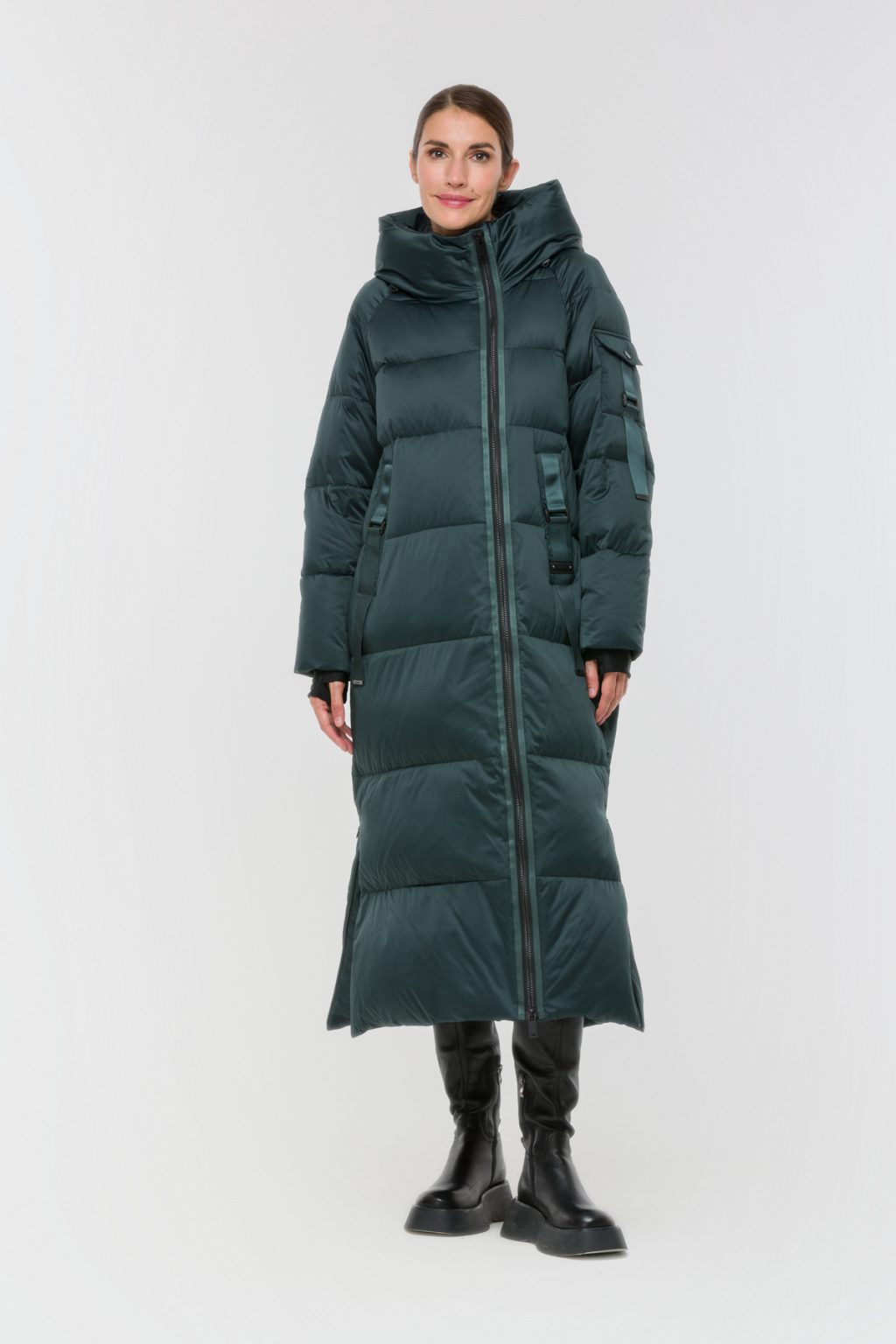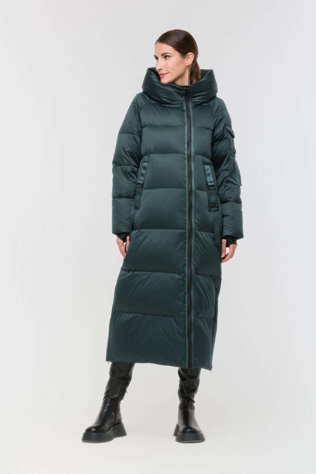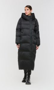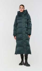 Длинный пуховик с горизонтальной стежкой