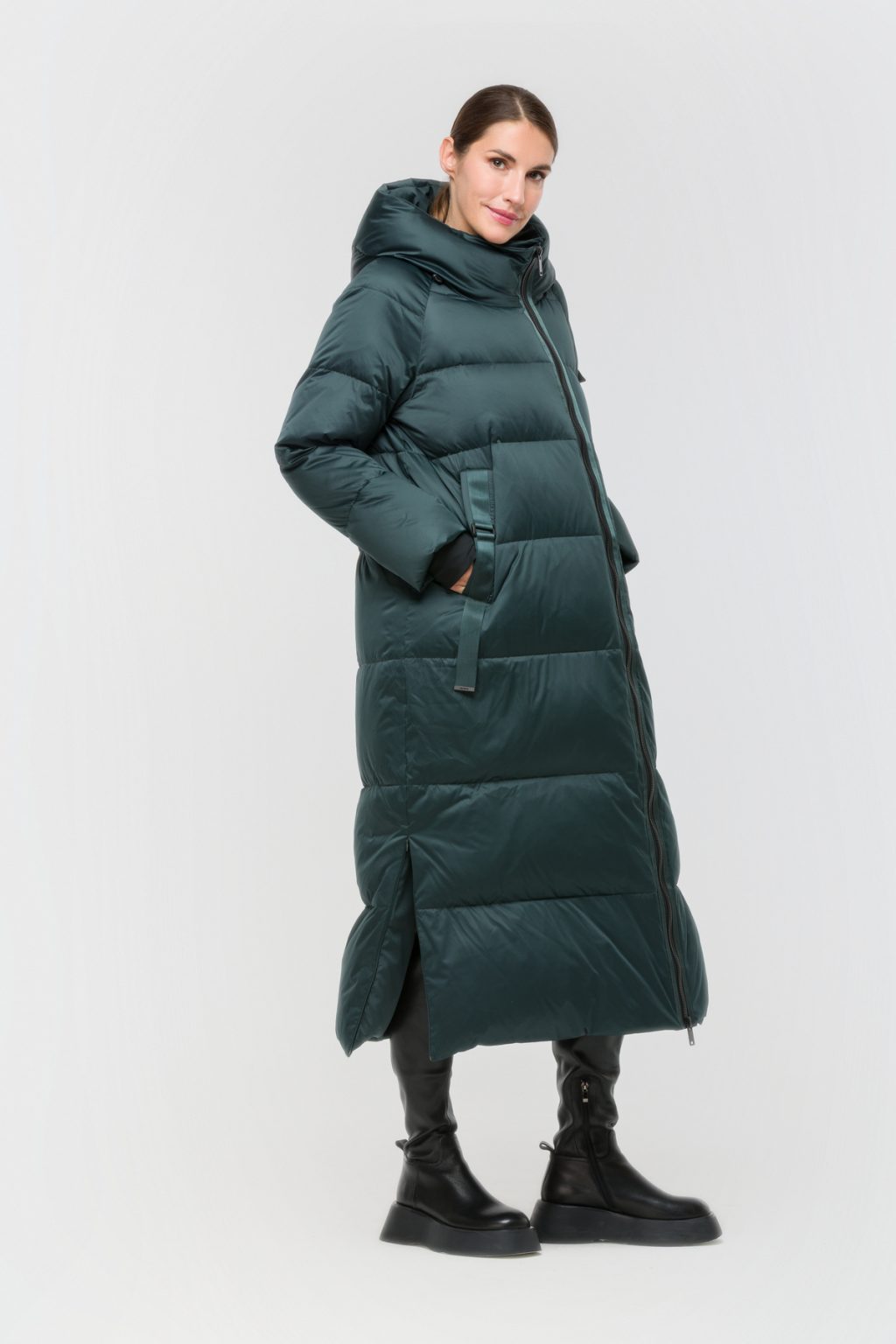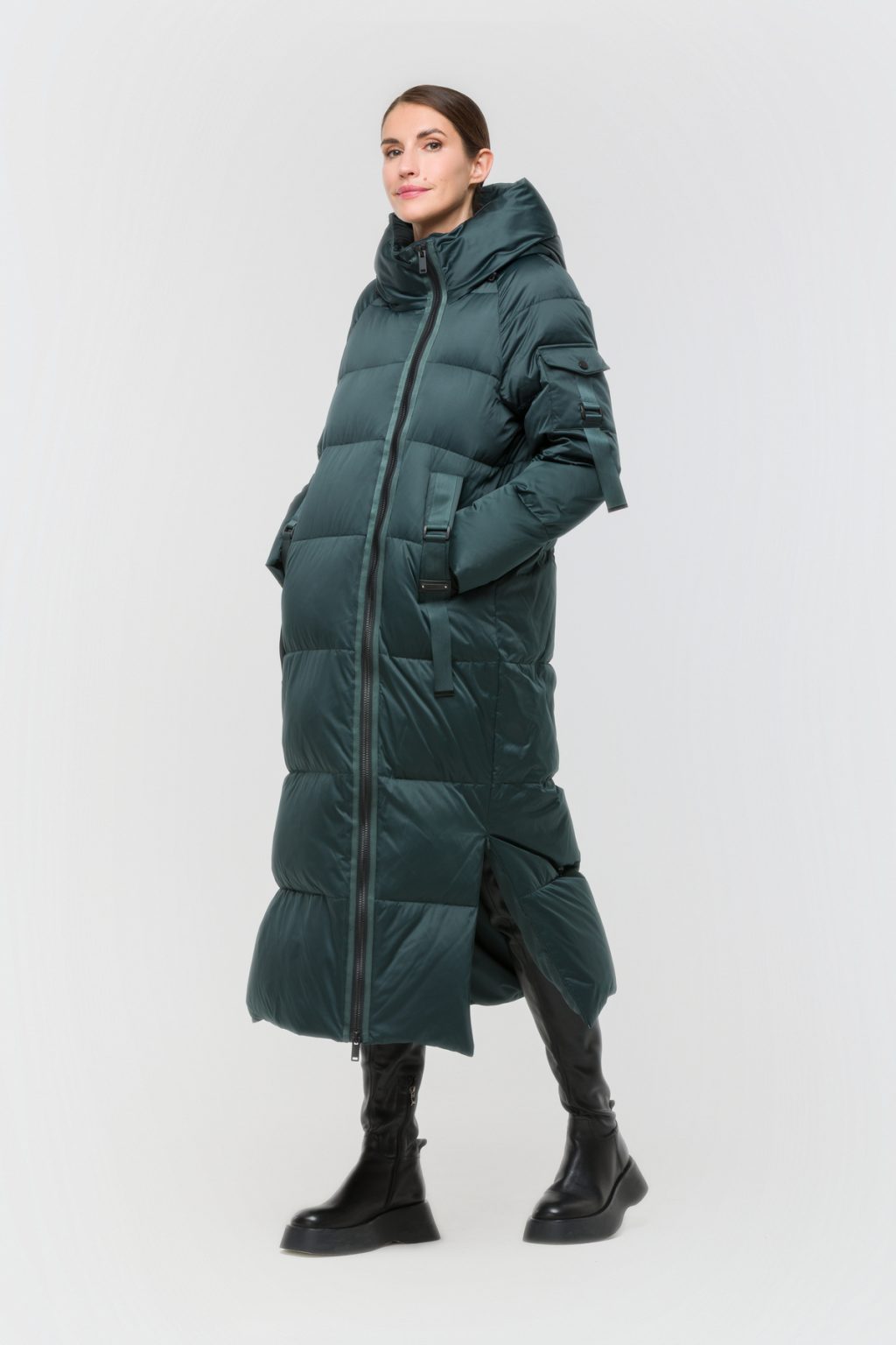 Длинный пуховик с горизонтальной стежкой сразу привлекает внимание своей лаконичной формой и современным характером. Его декорируют аккуратные ленты в тон, а чуть смещённая молния добавляет образу необычности, делая модель узнаваемой и динамичной. Подкладка мягко обволакивает, создавая ощущение комфорта в любую погоду, а наполнитель из пуха и пера помогает сохранять тепло даже в самые морозные дни, не утяжеляя силуэт. Прямой крой и длина макси позволяют чувствовать себя защищённо, при этом не ограничивая свободу движений. Два разреза по боковым швам на молнии делают посадку особенно удобной, добавляя лёгкости каждому шагу, а три кармана позволяют всегда иметь под рукой всё необходимое. Капюшон на затяжках становится надёжной защитой от ветра и снега, гармонично завершая образ, в котором каждая деталь продумана до мелочей. Такой пуховик органично вписывается в ритм большого города, оставаясь актуальным и практичным решением для тех, кто ценит стиль и комфорт даже в холодное время года. Лёгкость материалов, внимание к деталям и современный подход к классическим формам делают эту модель неотъемлемой частью зимнего гардероба, способной подчеркнуть индивидуальность и создать ощущение уверенности в любых условиях.