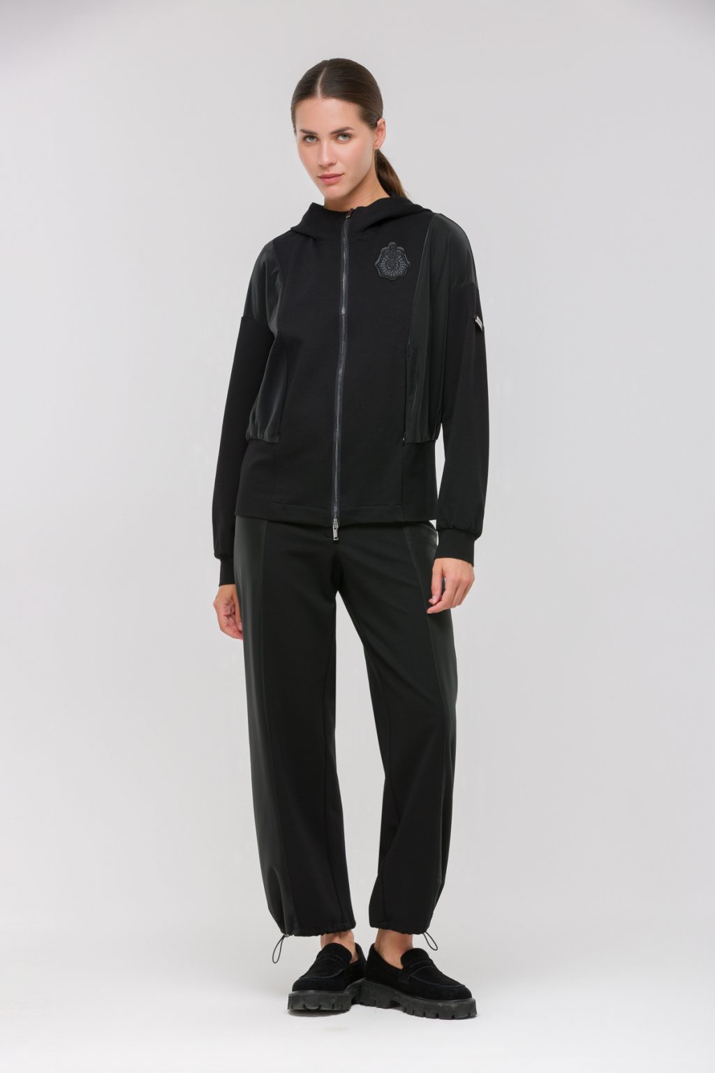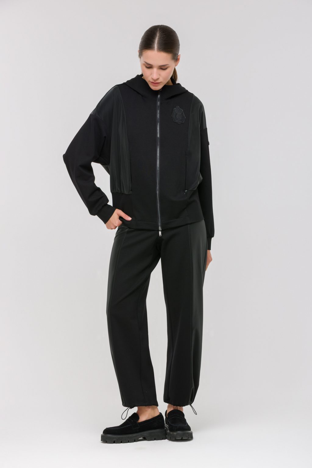 Куртка из трикотажного интерлока с отделкой из плащевой ткани создаёт ощущение лёгкости и уюта в любой ситуации. Мягкий материал приятно прилегает к телу, а прямой силуэт делает модель универсальной для повседневных прогулок и активного отдыха. Застёжка на молнии позволяет быстро собраться, не теряя времени на мелочи, а капюшон защитит от ветра и дождя, добавляя дополнительное чувство комфорта. Длинные рукава с манжетами аккуратно фиксируются у запястья, не сковывая движения, а два практичных кармана на молнии становятся надёжным местом для мелочей. Отделка из плащевой ткани не только подчёркивает современный характер куртки, но и делает её более устойчивой к внешним воздействиям. Отсутствие подкладки позволяет носить вещь в разное время года, сочетая с любимыми футболками или свитерами. Такая куртка легко вписывается в ритм большого города, создавая ощущение защищённости и свободы. Она становится отличной основой для ярких аксессуаров, позволяя каждый раз менять настроение и стиль, не изменяя своему комфорту..