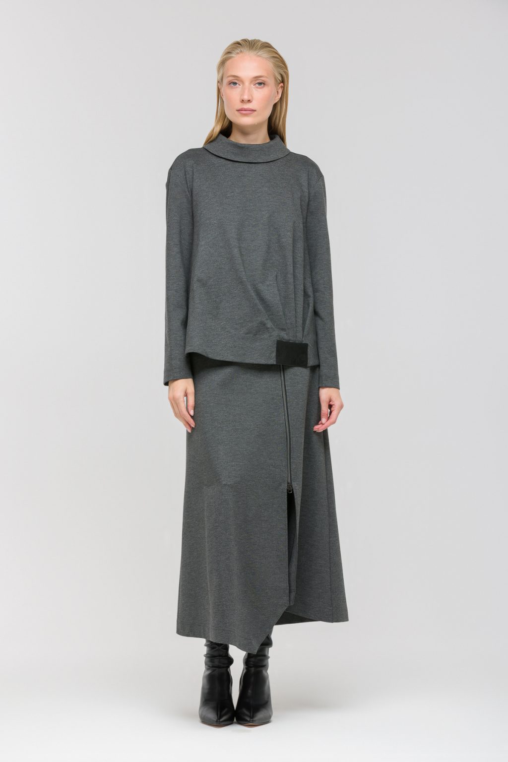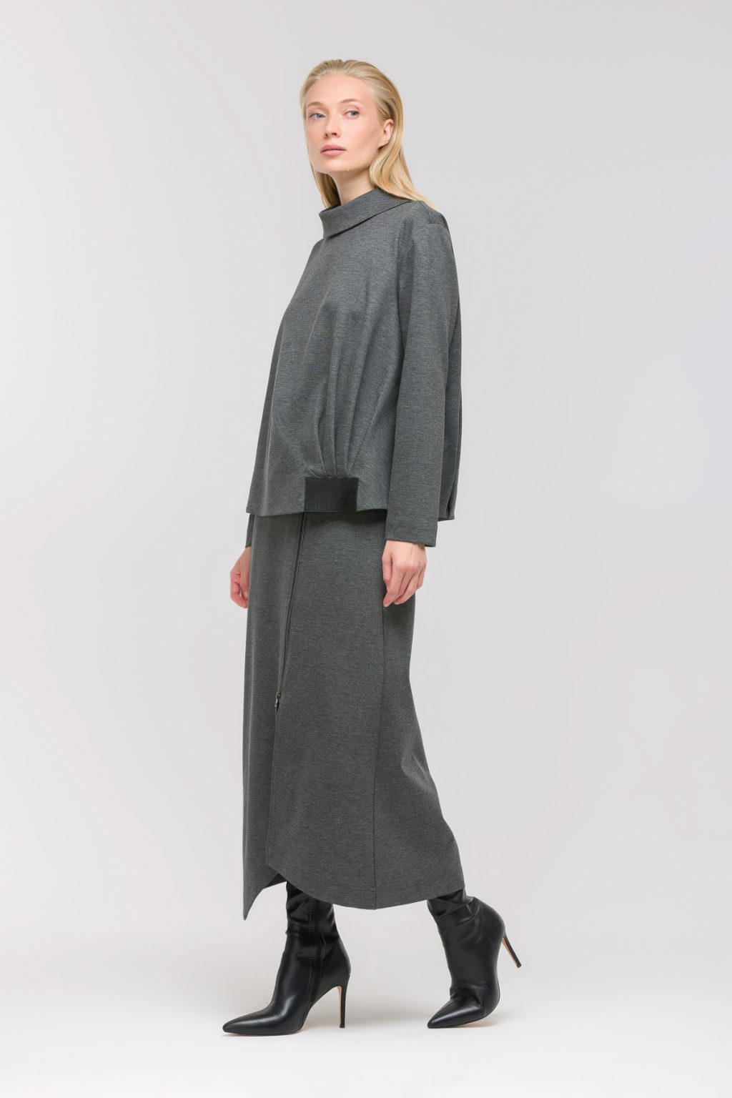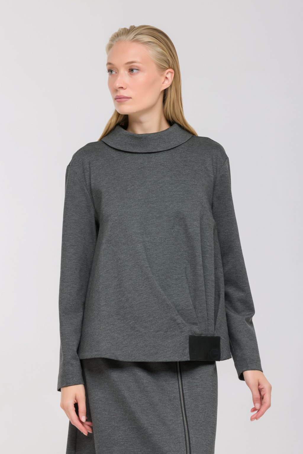Трикотажная блузка свободного кроя с отложным воротником легко становится основой современного гардероба. Ее мягкая ткань дарит ощущение уюта на протяжении всего дня, а свободный силуэт гармонично подчеркивает индивидуальность и позволяет оставаться собой в любой ситуации. Длинные рукава и спущенная линия плеча создают расслабленный образ, а асимметричные складки под логотип добавляют интересный акцент, который сразу привлекает внимание. Особое настроение задает декоративная молния на спине — этот небольшой, но выразительный элемент подчеркивает уникальность и неординарный взгляд на привычные детали. Отложной воротник придает образу завершенность, а низ на резинке гарантирует идеальную посадку и свободу движений. Блузка гармонично сочетается как с классическими брюками, так и с джинсами, позволяя легко менять настроение и стиль, не теряя ощущения комфорта. В ней хочется встречать новый день, ощущая легкость и уверенность в каждом мгновении.