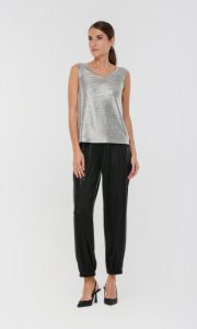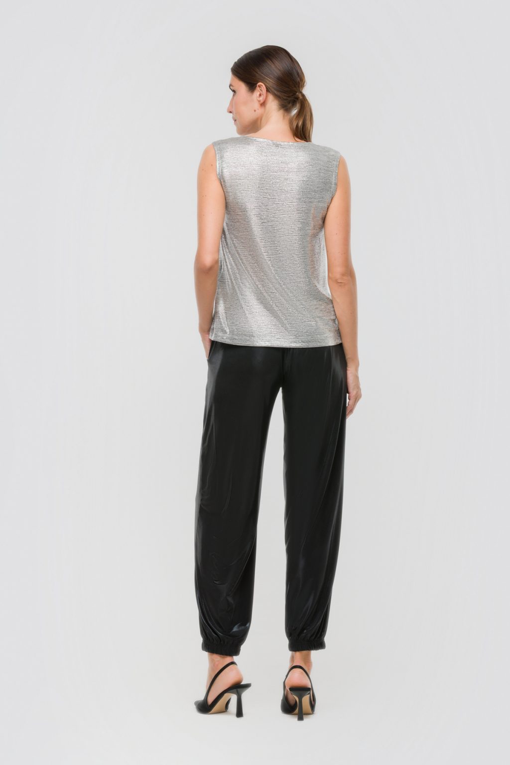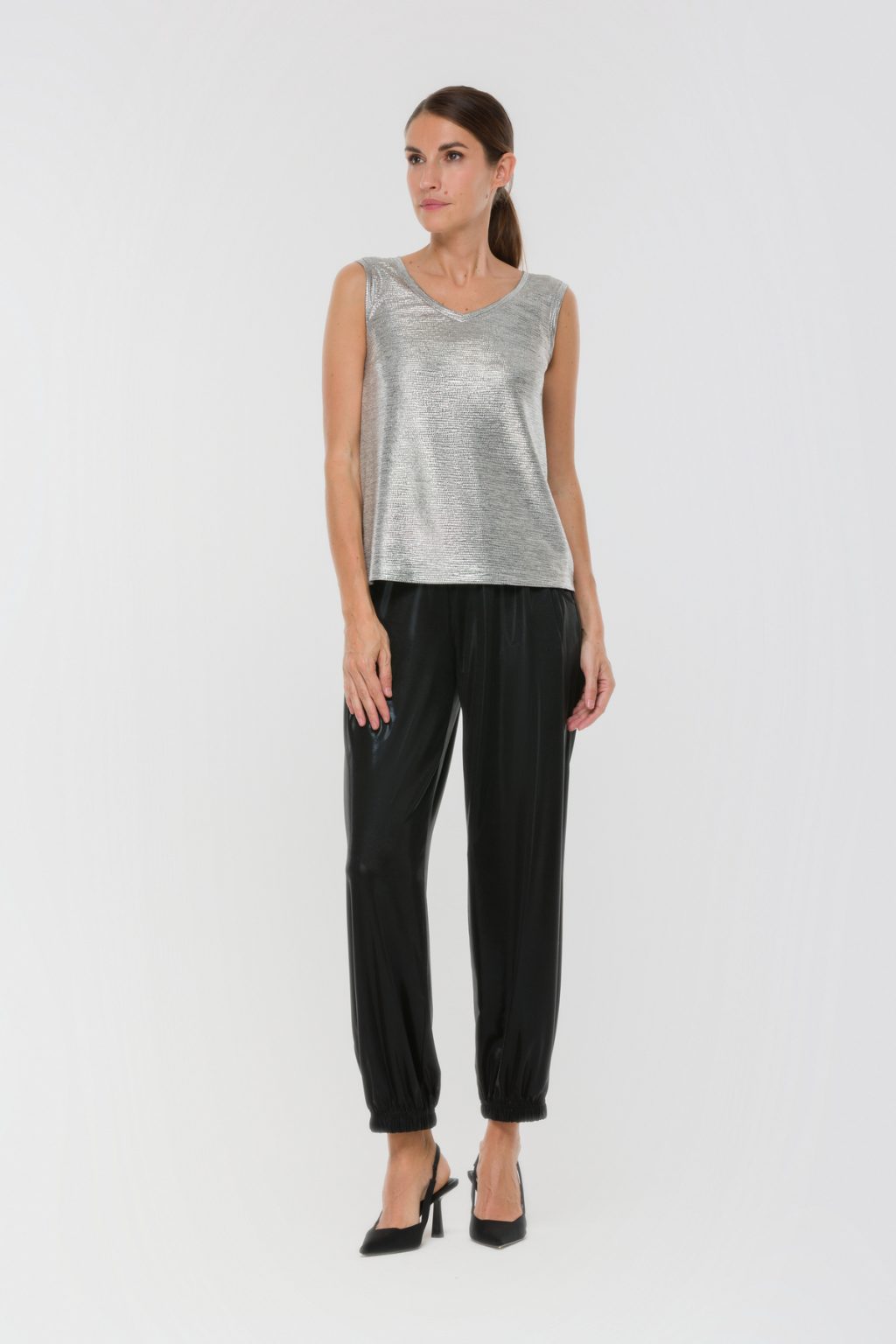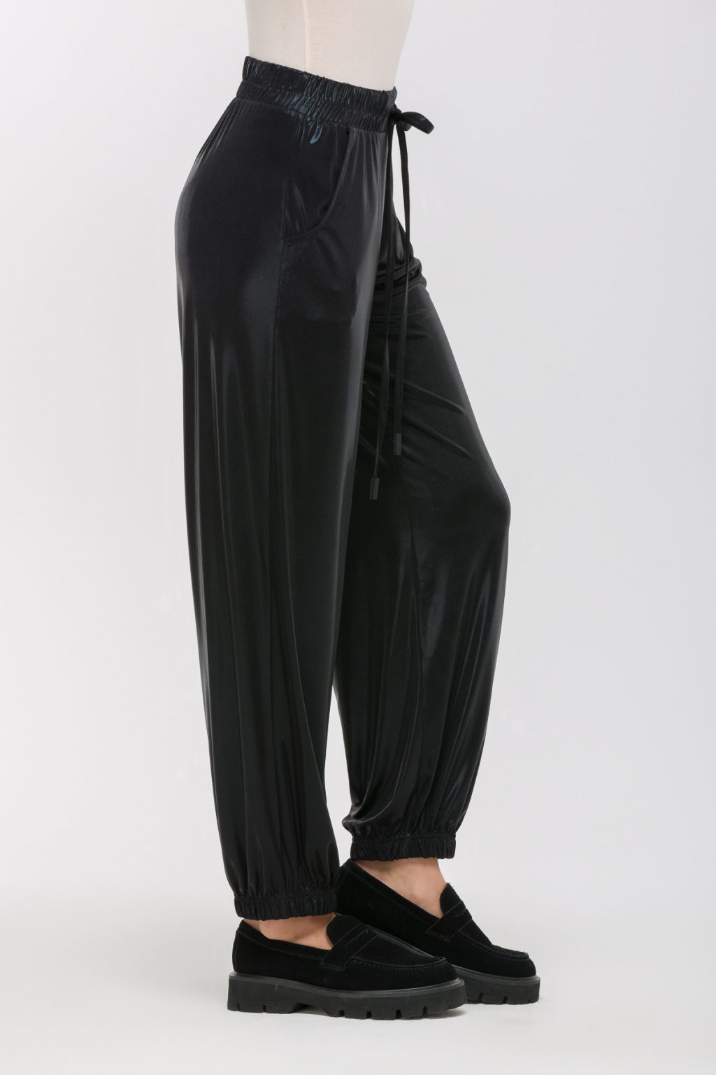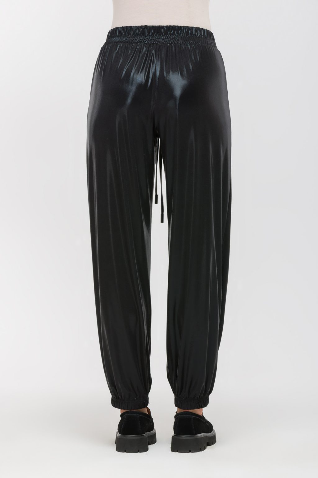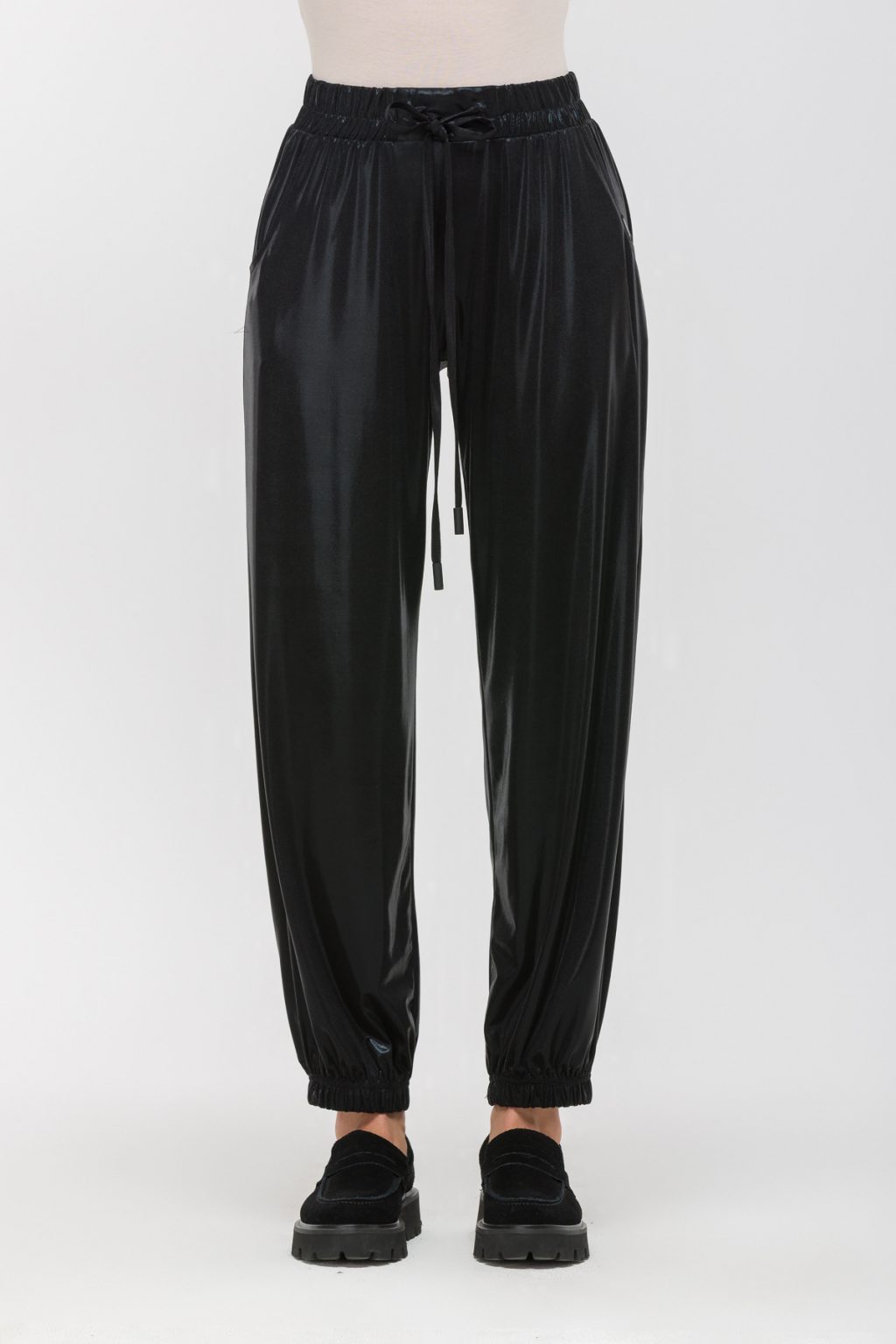 Зауженные брюки из матового трикотажа под латекс создают запоминающийся образ, в котором сочетаются современная эстетика и комфорт. Мягкая ткань с легким матовым блеском напоминает о дерзких модных тенденциях, но при этом сохраняет ощущение уюта и свободы движения. Отсутствие застежек и эластичный пояс с завязками позволяют легко подогнать брюки по фигуре, не создавая ни малейшего дискомфорта даже в самый насыщенный день. Средняя посадка мягко подчеркивает линию талии, делая силуэт стройнее, а зауженная форма и резинка на низе брюк акцентируют внимание на обуви и добавляют динамики в каждом движении. Наклонные карманы в боковом шве делают образ не только стильным, но и практичным, позволяя всегда держать под рукой все необходимое. Эти брюки легко вписываются в любой гардероб: их можно сочетать с объемными свитшотами, лаконичными рубашками или яркими топами, создавая самые разные настроения — от расслабленного до по-настоящему яркого. Такой выбор помогает ощущать себя уверенно и свободно, не теряя индивидуальности ни на минуту.
