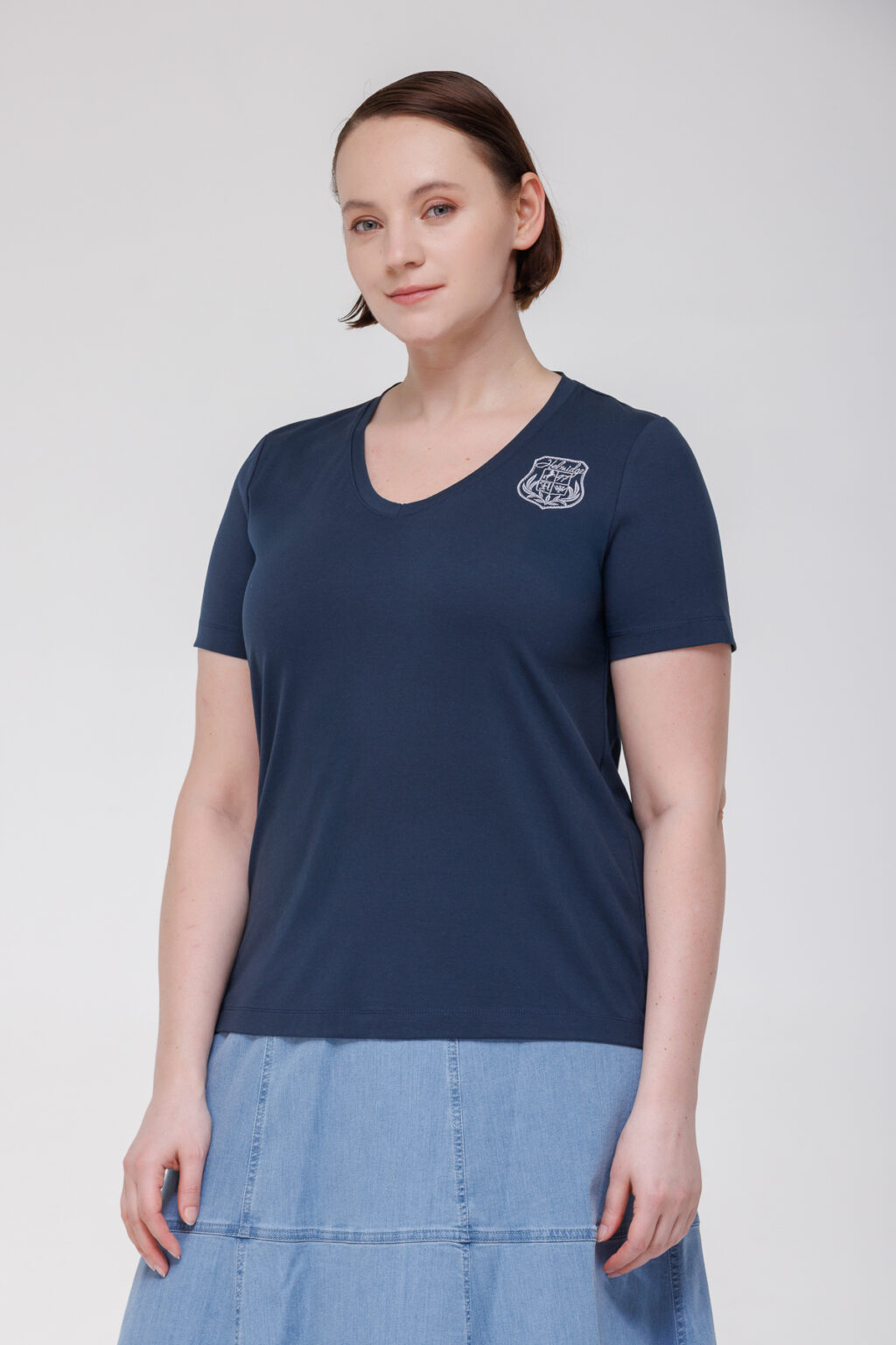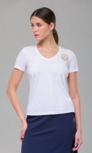 Короткие рукава делают модель практичной для летнего сезона, обеспечивая удобство при высоких температурах. V‑образный вырез горловины придаёт изделию элегантность, визуально вытягивая линию шеи и создавая гармоничный силуэт. Вышитый логотип бренда выступает в роли деликатного акцента: он подчёркивает принадлежность к определённому стилю, не перегружая общий вид.