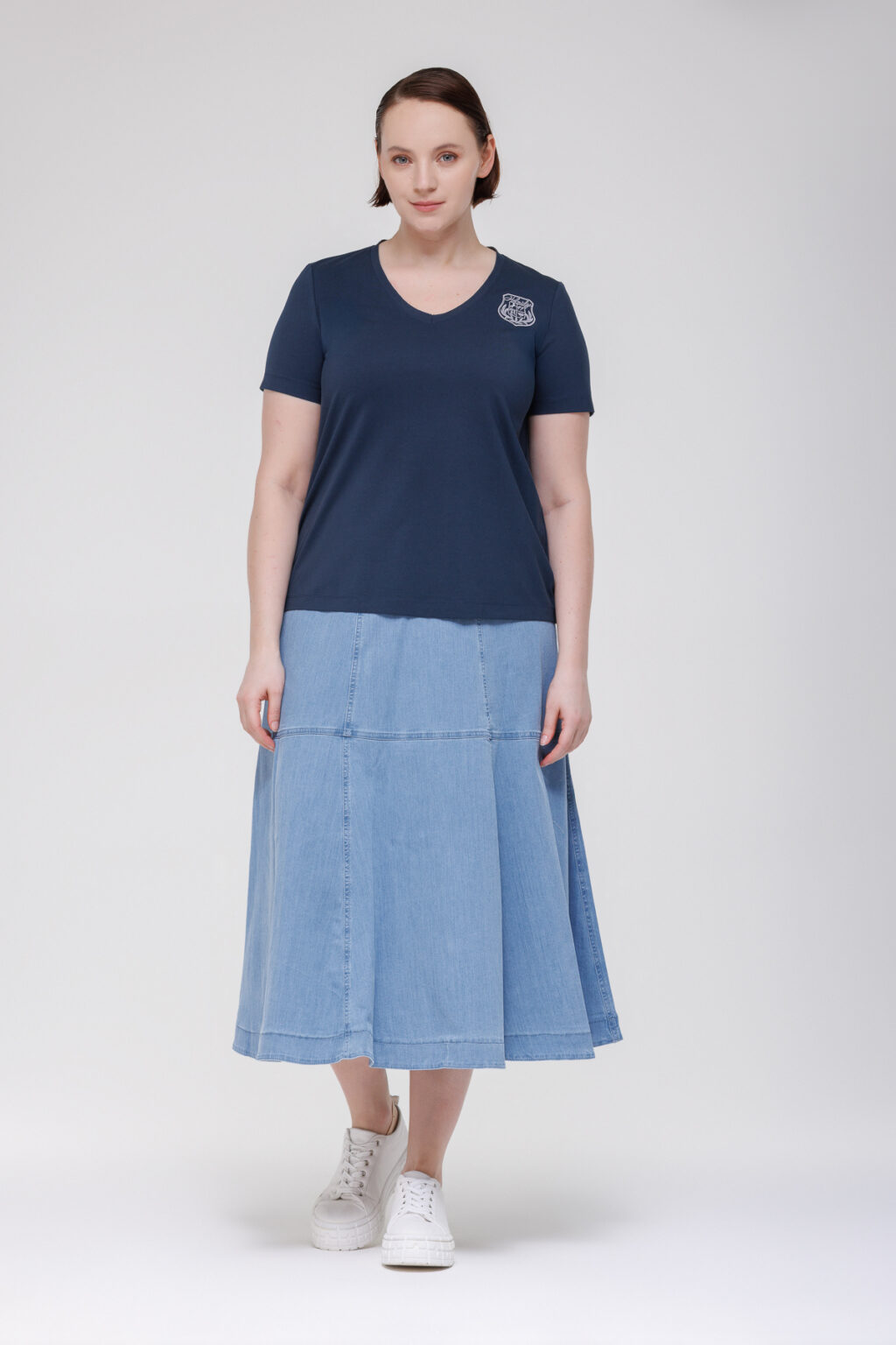 Модель легко комбинируется с различными предметами гардероба. С джинсами и кроссовками футболка создаёт непринуждённый повседневный образ для прогулок по городу или встреч с друзьями. С юбкой‑миди и лодочками она подойдёт для неформальных деловых встреч. В прохладную погоду изделие можно дополнить жакетом или объёмным кардиганом, формируя многослойные ансамбли для межсезонья. Универсальность кроя и качество материалов делают эту футболку практичным и актуальным элементом гардероба, который можно носить как самостоятельно, так и в составе сложных композиций.
