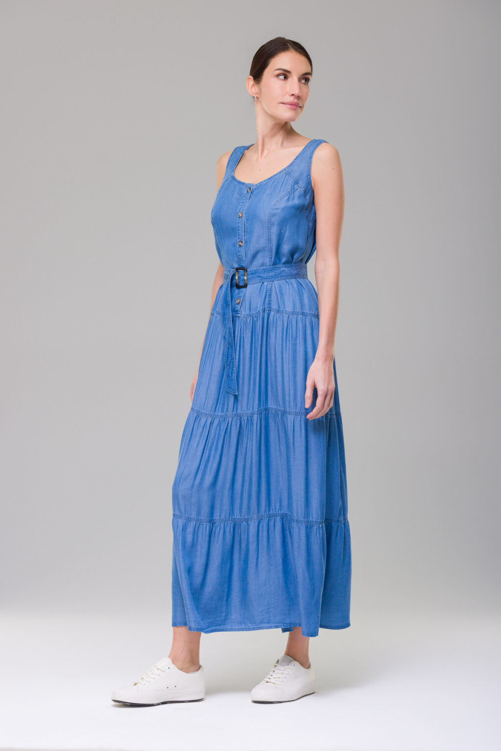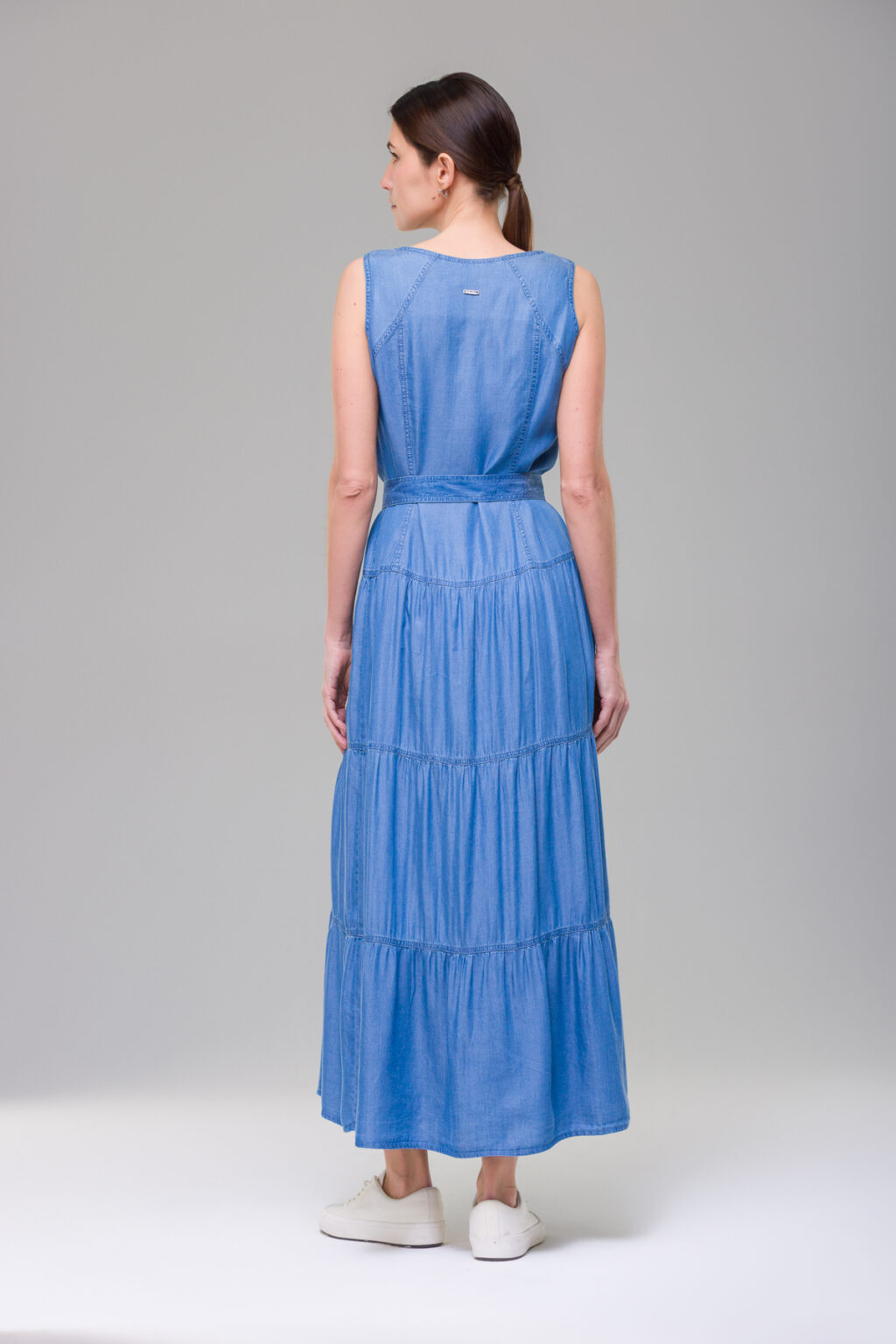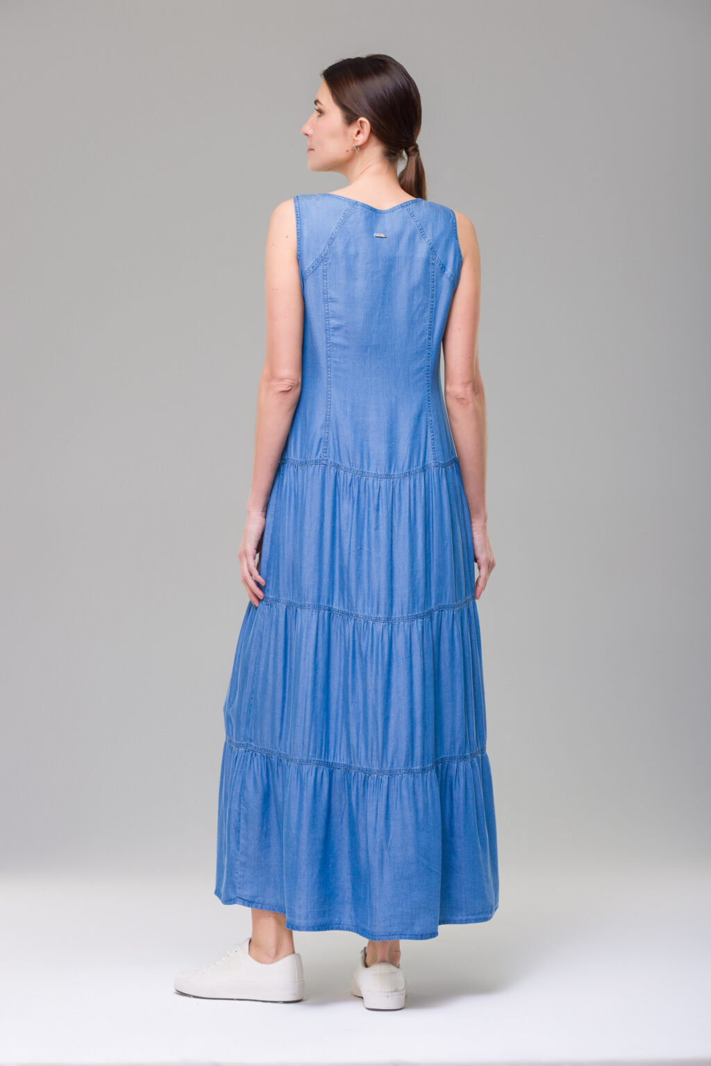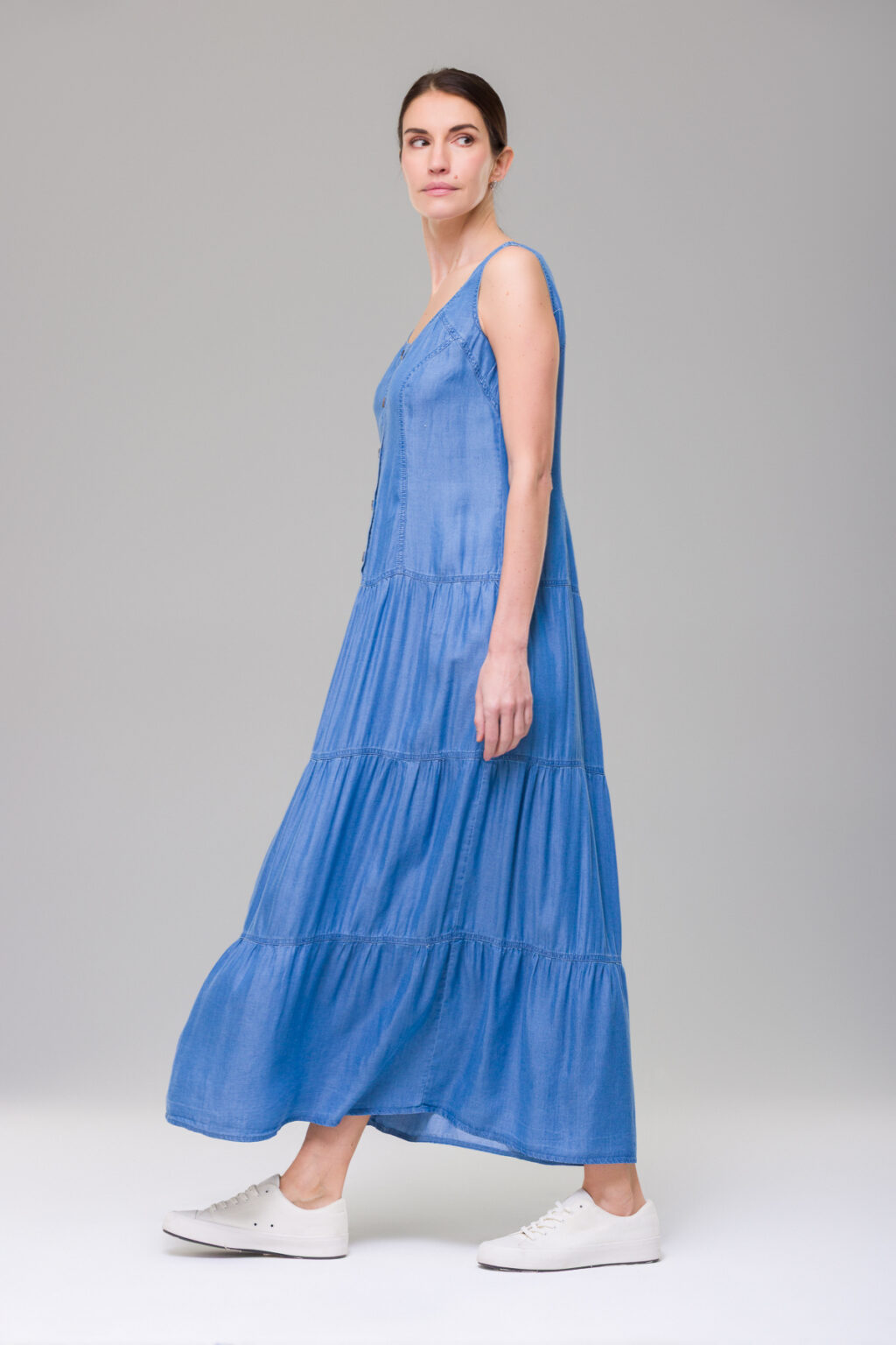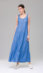 Ярусный сарафан из тонкой вареной джинсовой ткани сочетает в себе непринуждённую эстетику денима с изящным силуэтом, подчёркивающим женственность образа. Застёжка на пуговицы обеспечивает удобство эксплуатации и добавляет модели структурированности, сохраняя при этом лёгкость и непринуждённость общего вида.