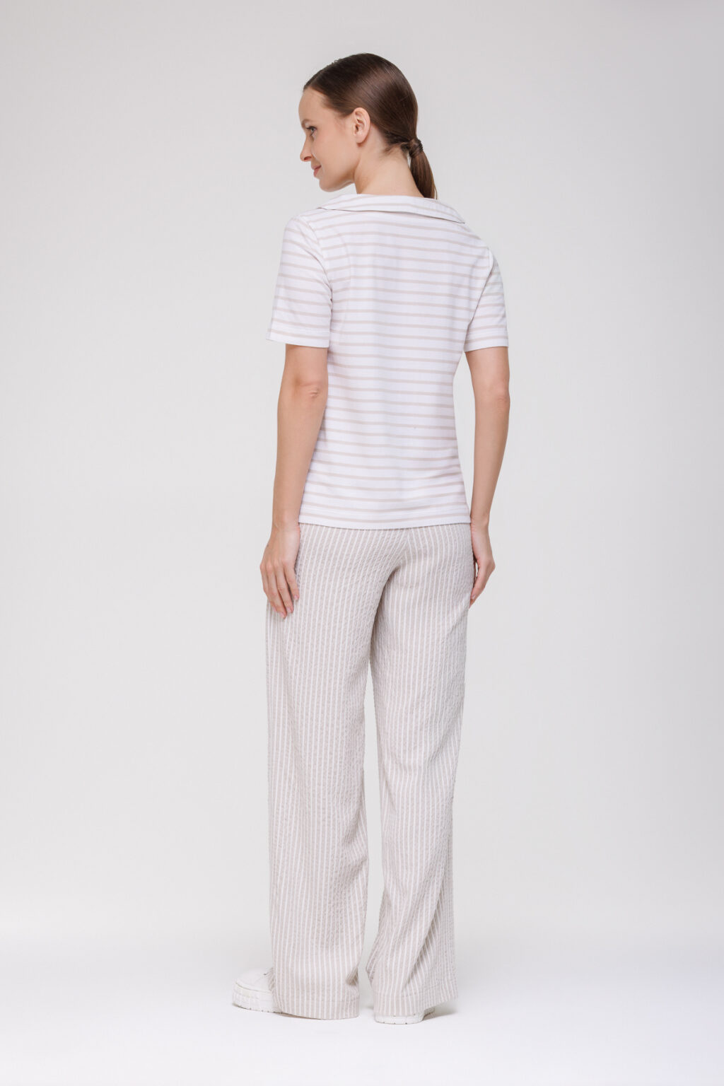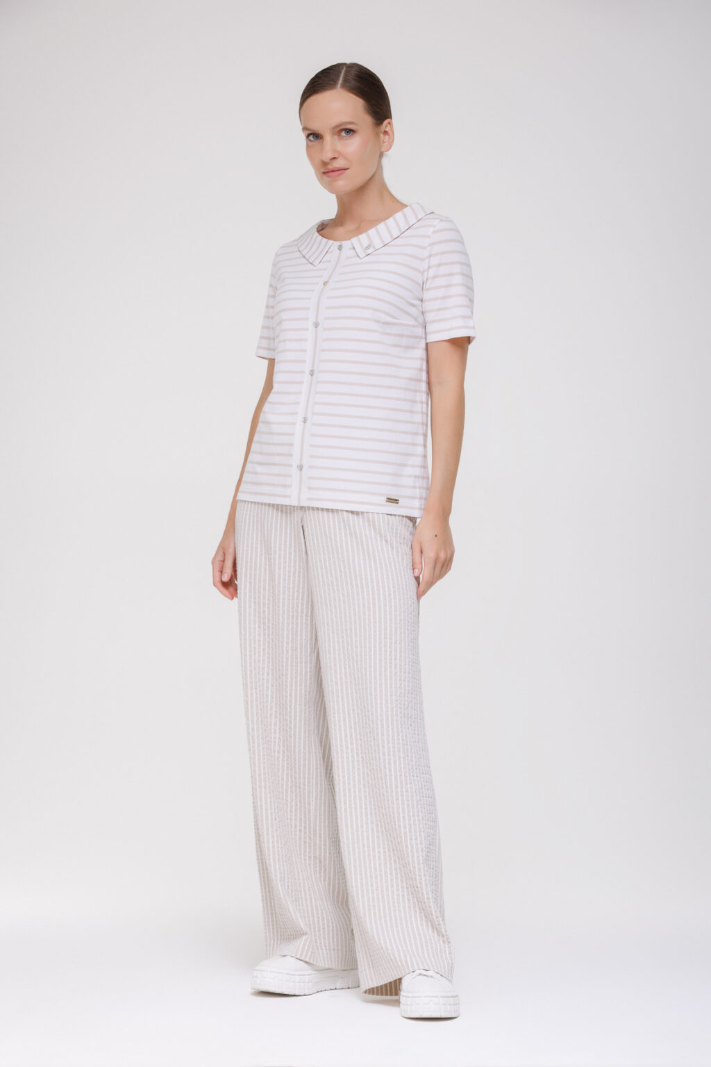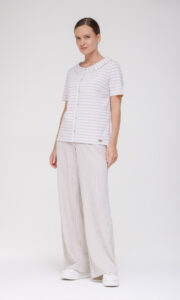 Трикотажная блузка в полоску с отложным воротником и декоративными пуговицами воплощает баланс классики и современности, предлагая универсальное решение для разнообразных стилистических задач. Модель выполнена без застёжки, что придаёт ей непринуждённый, расслабленный характер и обеспечивает комфорт в носке — такой крой позволяет избежать излишнего давления на тело и гарантирует свободу движений в течение всего дня.
