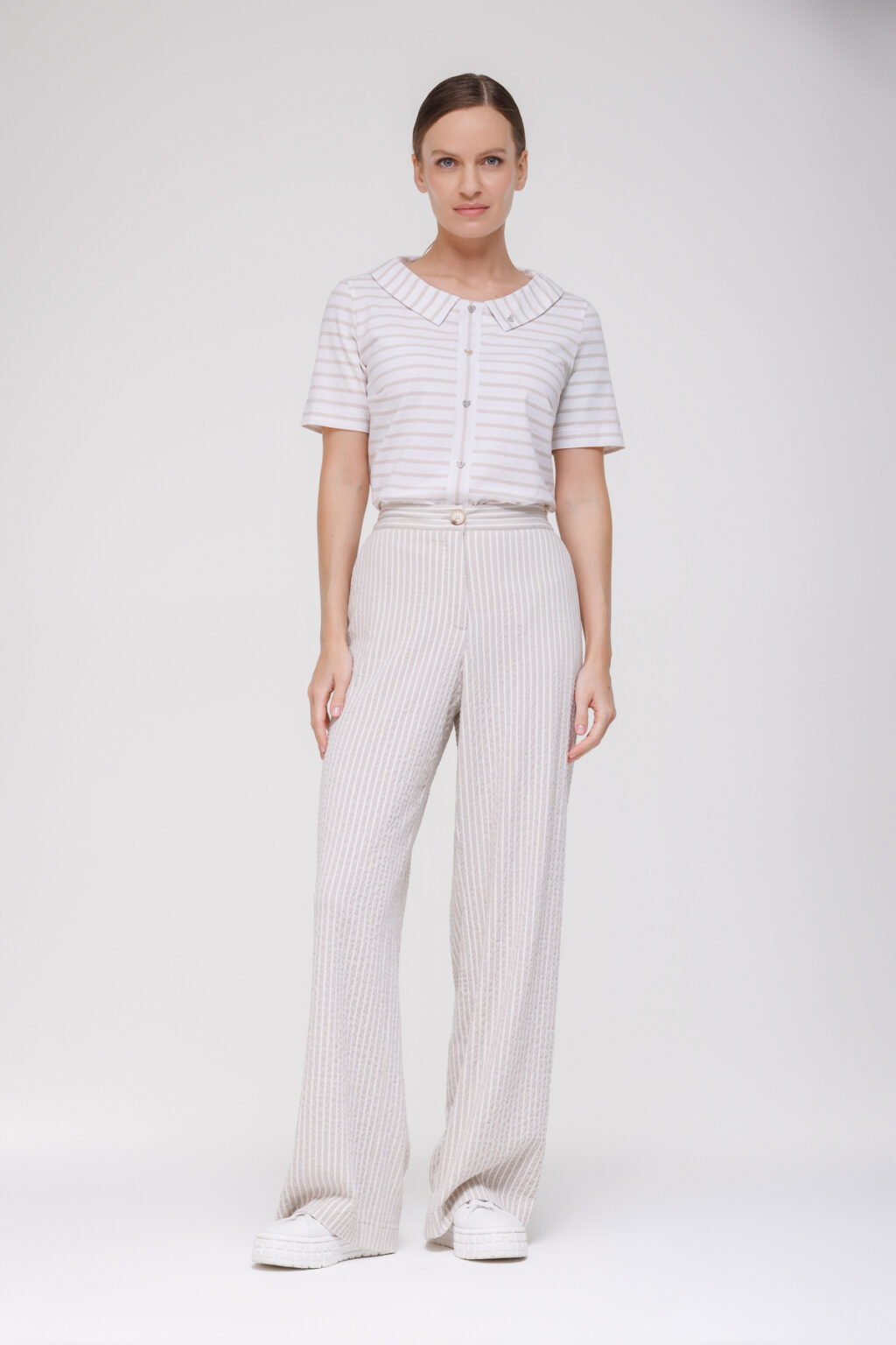 Отложной воротник придаёт модели структурированность и элегантность, мягко обрамляет линию шеи и добавляет образу формальности без излишней строгости. Полосатый принт структурирует силуэт, визуально корректирует пропорции и остаётся актуальным вне сезонных трендов, а декоративные пуговицы выступают в роли изящного акцента — они обогащают дизайн, подчёркивают внимание к деталям и добавляют изделию индивидуальности.