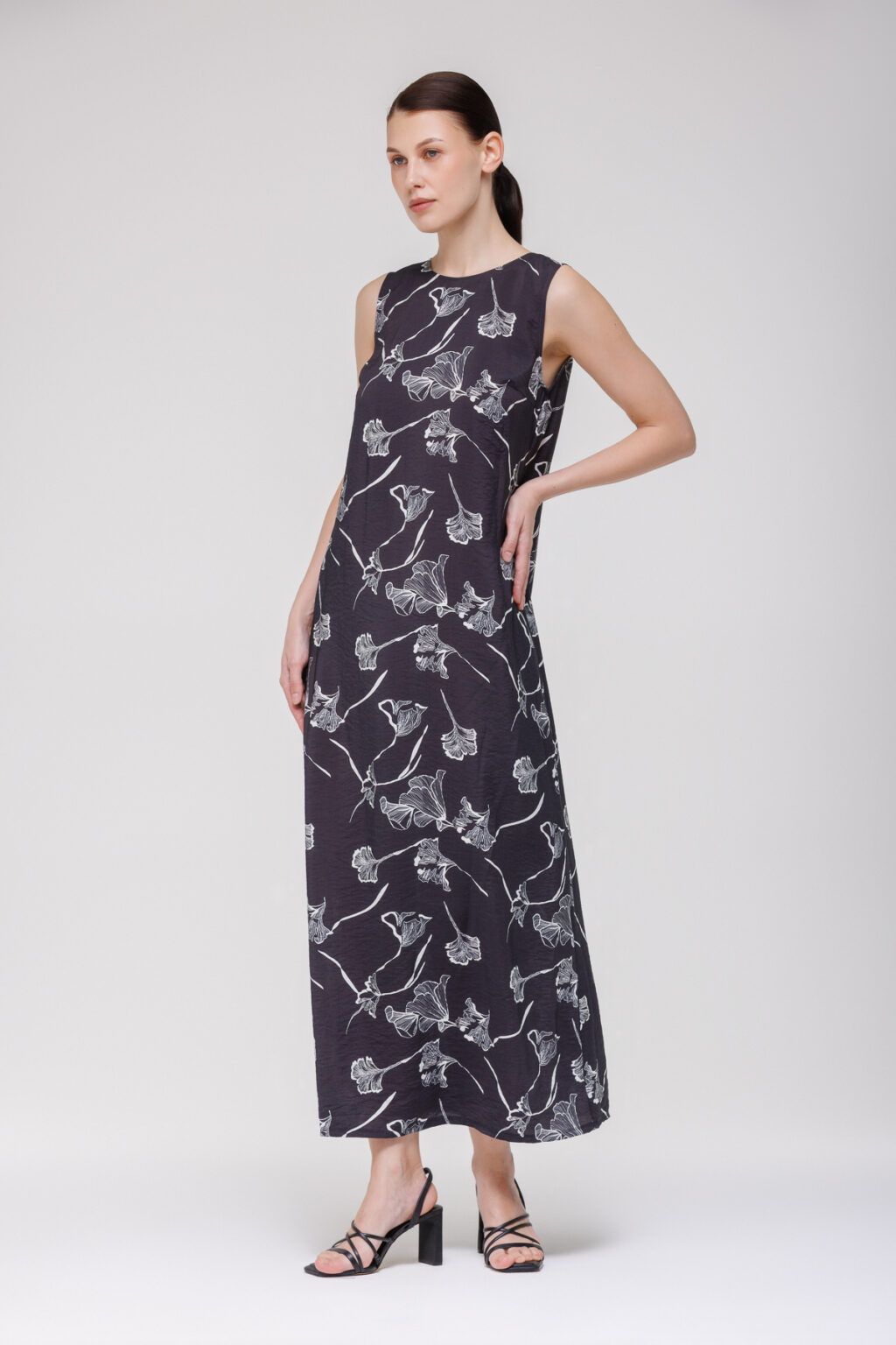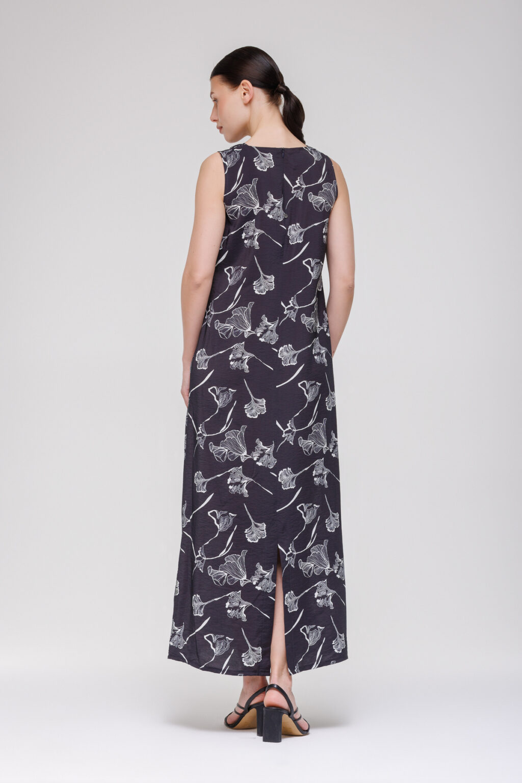 Силуэт‑трапеция мягко облегает фигуру и расширяется книзу, визуально корректируя пропорции и обеспечивая полную свободу движений. Длина макси визуально вытягивает силуэт, делая образ более элегантным и завершённым. Разрез по заднему шву выполняет практическую функцию: он облегчает движения при ходьбе и добавляет динамику общему виду — ткань изящно струится при каждом шаге.