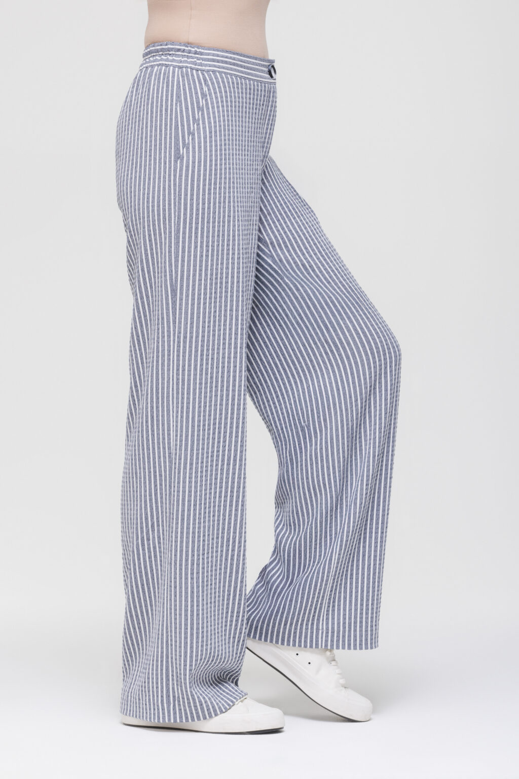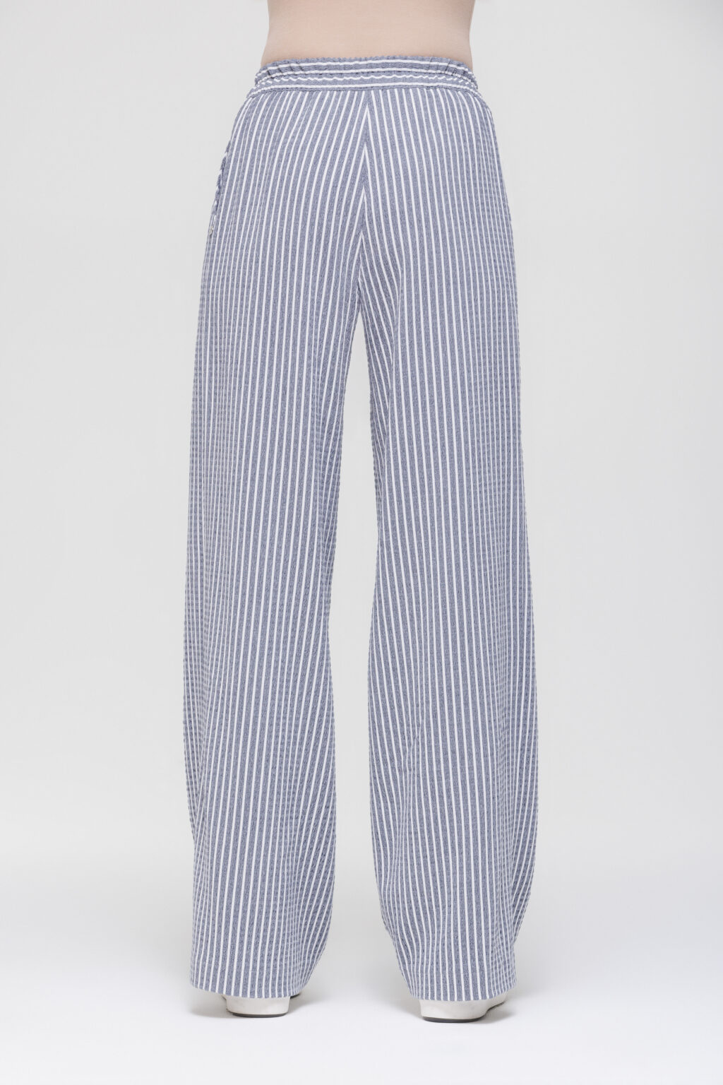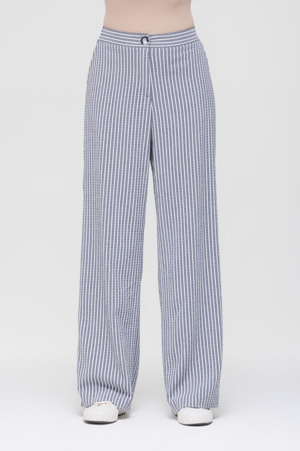 Полосатый принт визуально корректирует силуэт: в зависимости от направления полос он может вытягивать фигуру или добавлять объёма в нужных местах, что позволяет использовать брюки для создания разнообразных визуальных эффектов. Смесовая жатая ткань на основе вискозы отличается приятной текстурой и мягкой драпировкой, хорошо держит форму, не сковывает движений и обеспечивает достаточную воздухопроницаемость — это делает брюки подходящими для носки в тёплое время года и в межсезонье.