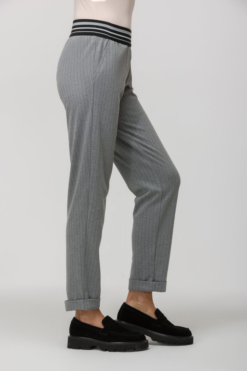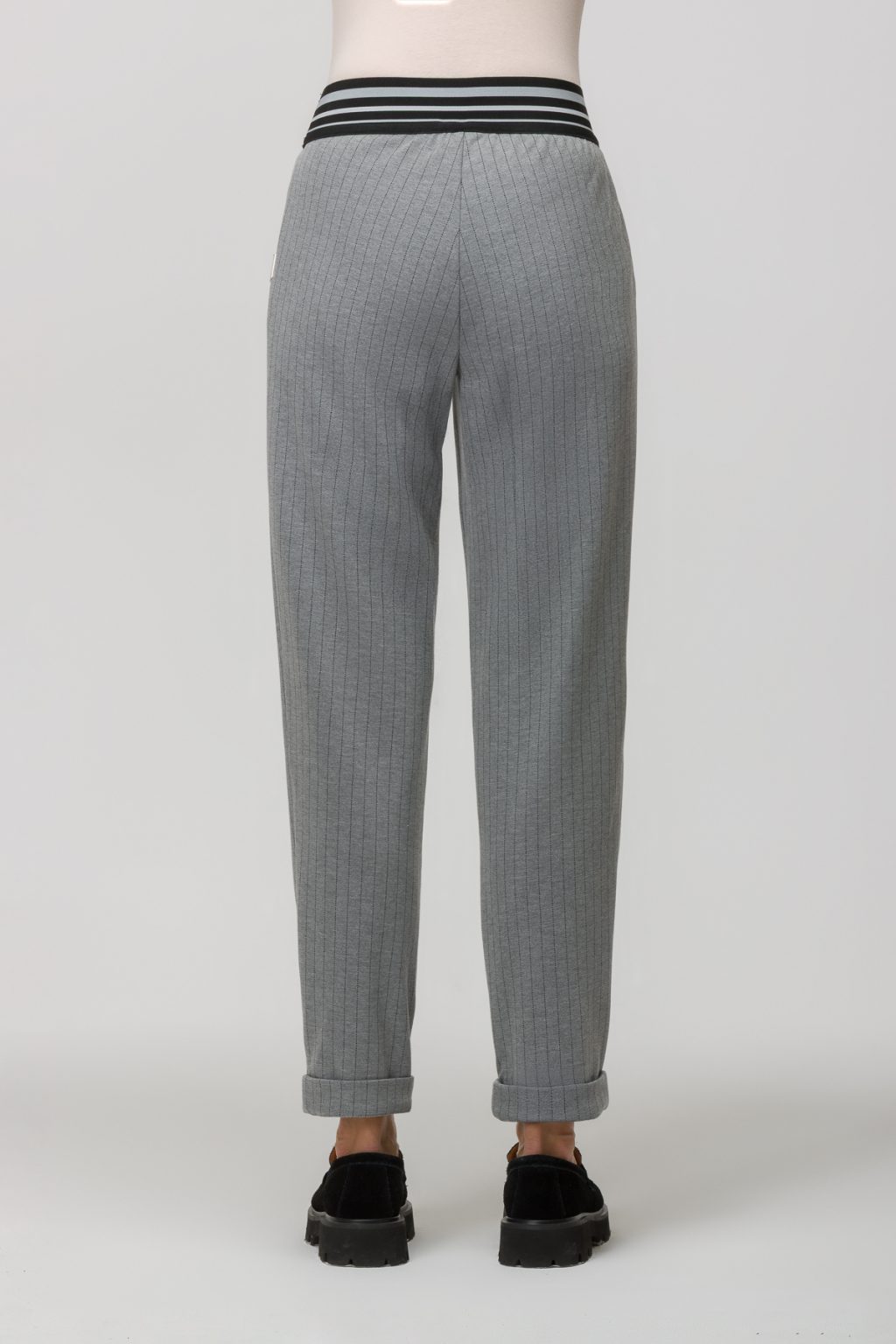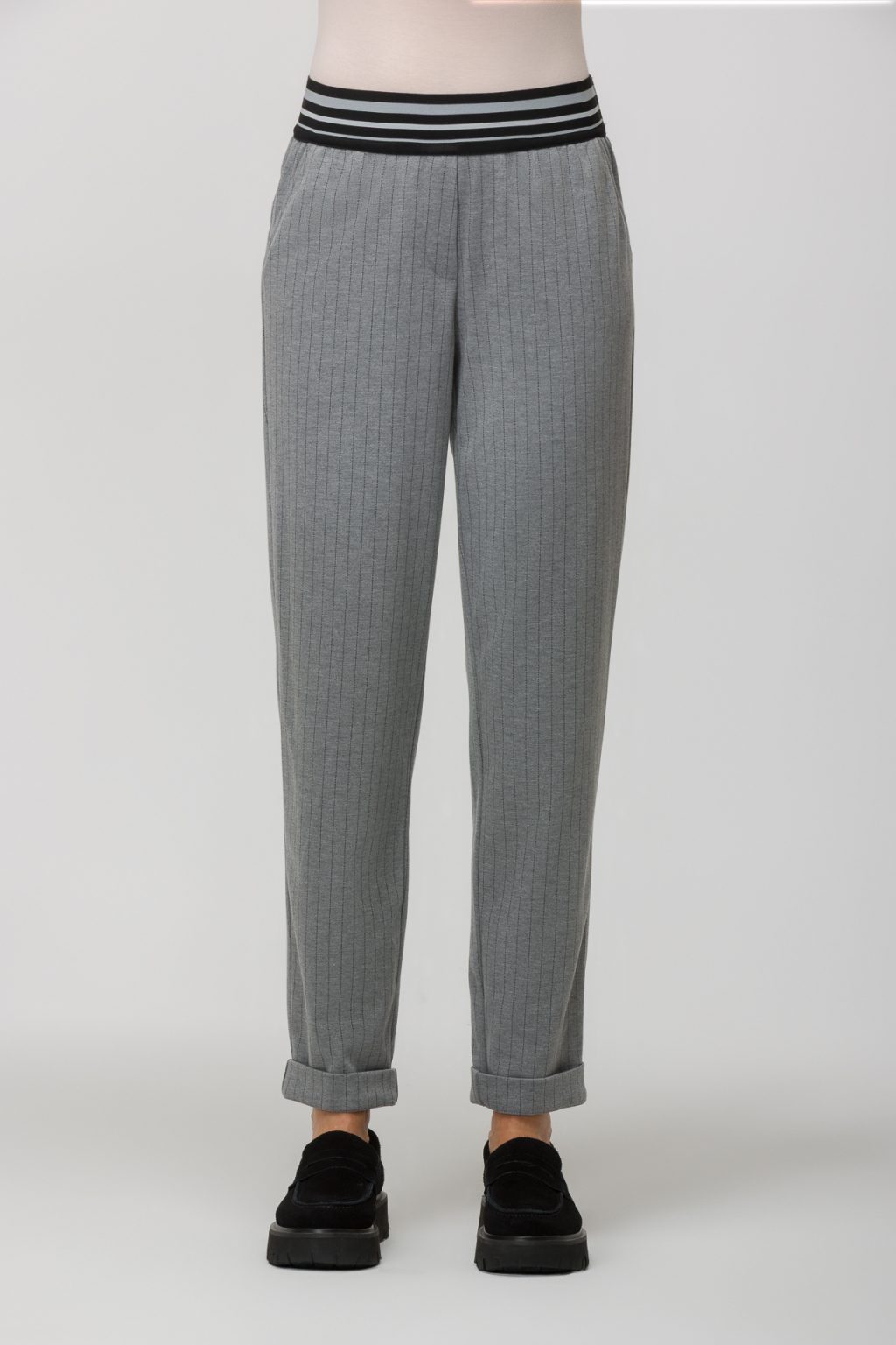 Трикотажные брюки зауженного кроя с лаконичным принтом в полоску — универсальное решение для комфортных образов на каждый день. Модель выполнена из мягкого эластичного материала, имеет среднюю посадку на талии и пояс на удобной резинке, что обеспечивает отличную посадку и свободу движений. Брюки без застежки, дополнены двумя наклонными боковыми карманами, которые добавляют практичности. Зауженный силуэт визуально вытягивает ноги и легко сочетается с различной обувью.