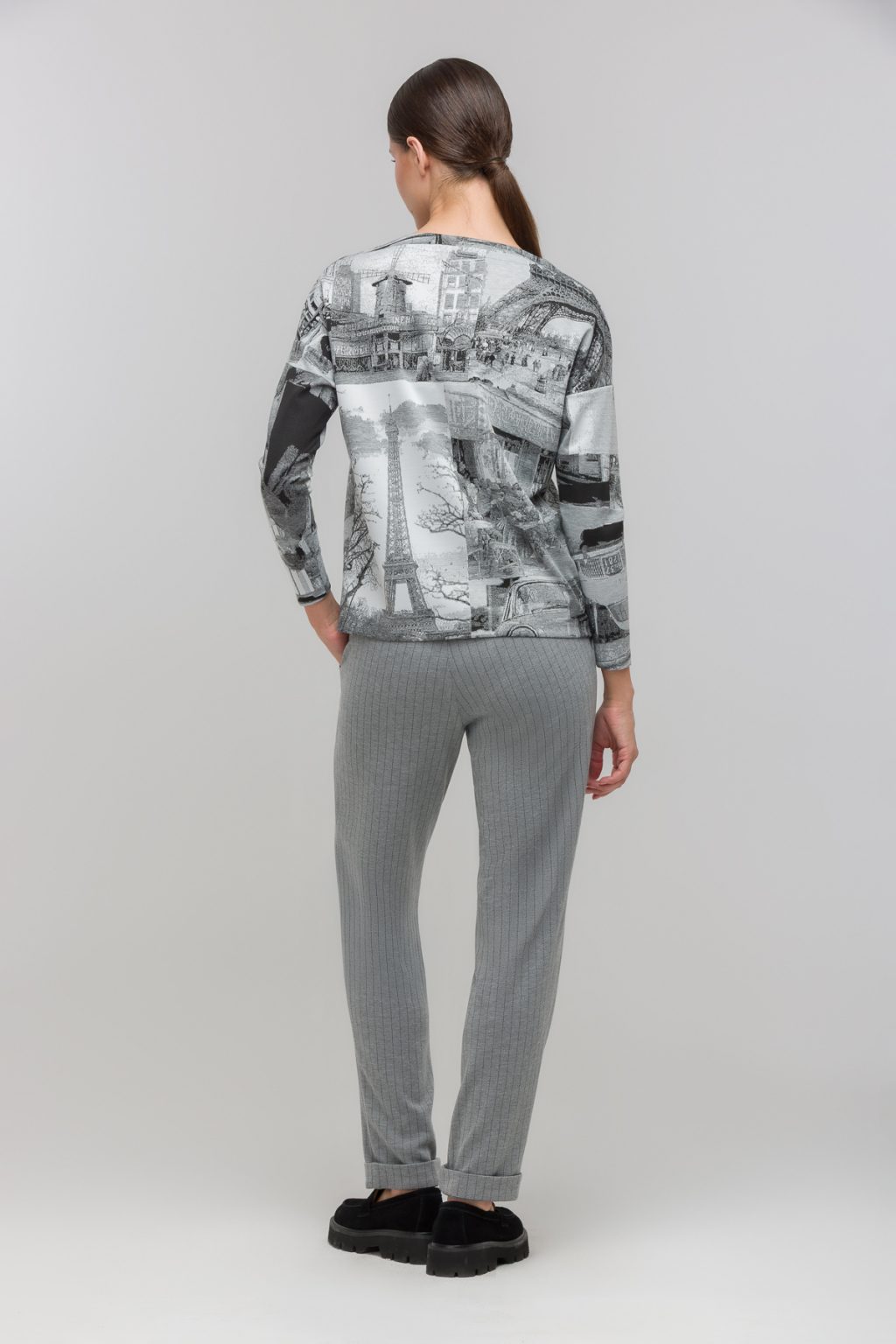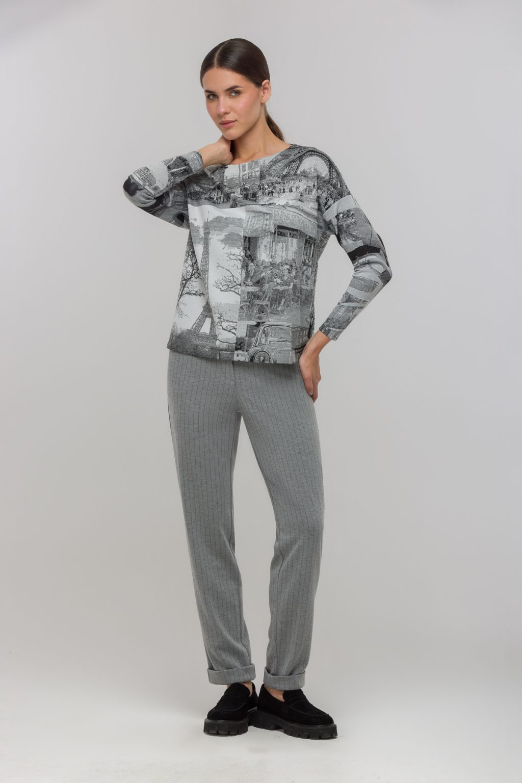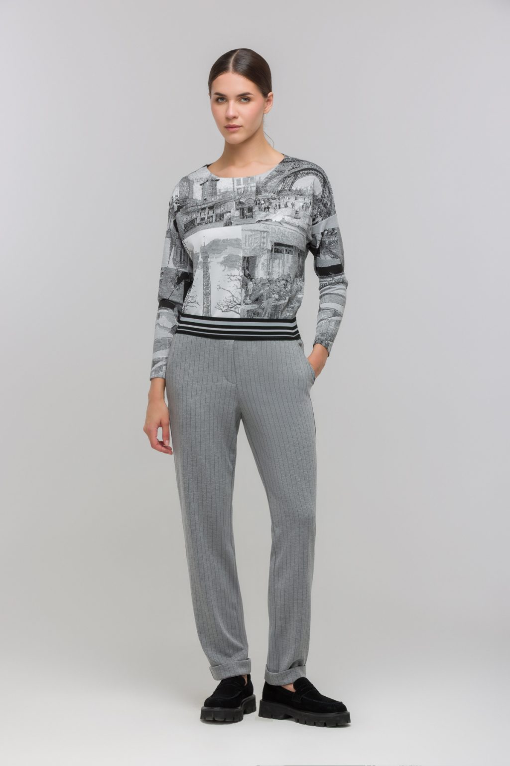 Трикотажные брюки зауженного кроя с лаконичным принтом в полоску — универсальное решение для комфортных образов на каждый день. Модель выполнена из мягкого эластичного материала, имеет среднюю посадку на талии и пояс на удобной резинке, что обеспечивает отличную посадку и свободу движений. Брюки без застежки, дополнены двумя наклонными боковыми карманами, которые добавляют практичности. Зауженный силуэт визуально вытягивает ноги и легко сочетается с различной обувью.