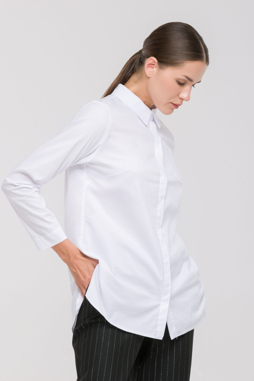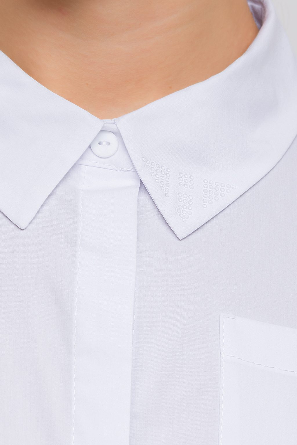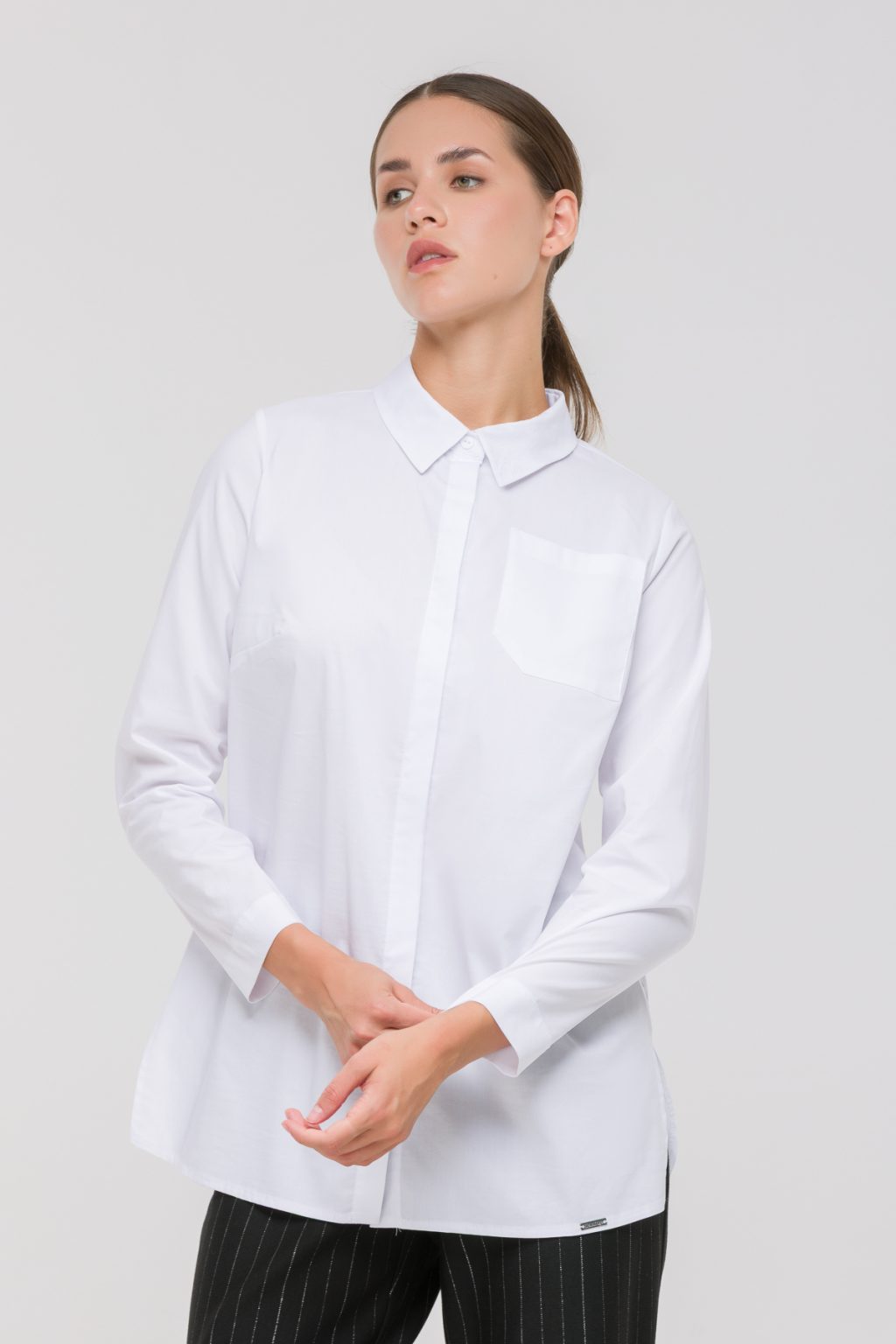Удлиненная рубашка из эластичной смесовой ткани на основе хлопка декорирована стразами в тон на воротнике и имитацией застежки на спине — стильное решение для современных образов. Модель отличается прямым силуэтом, асимметричным округлым низом с разрезами по бокам и накладным карманом. Особое внимание привлекает отложной воротник, украшенный стразами в тон, который добавляет изысканный акцент. Застёжка на пуговицы и длинные рукава обеспечивают комфорт и универсальность. Изделие сочетает элегантность, комфорт и современный стиль.