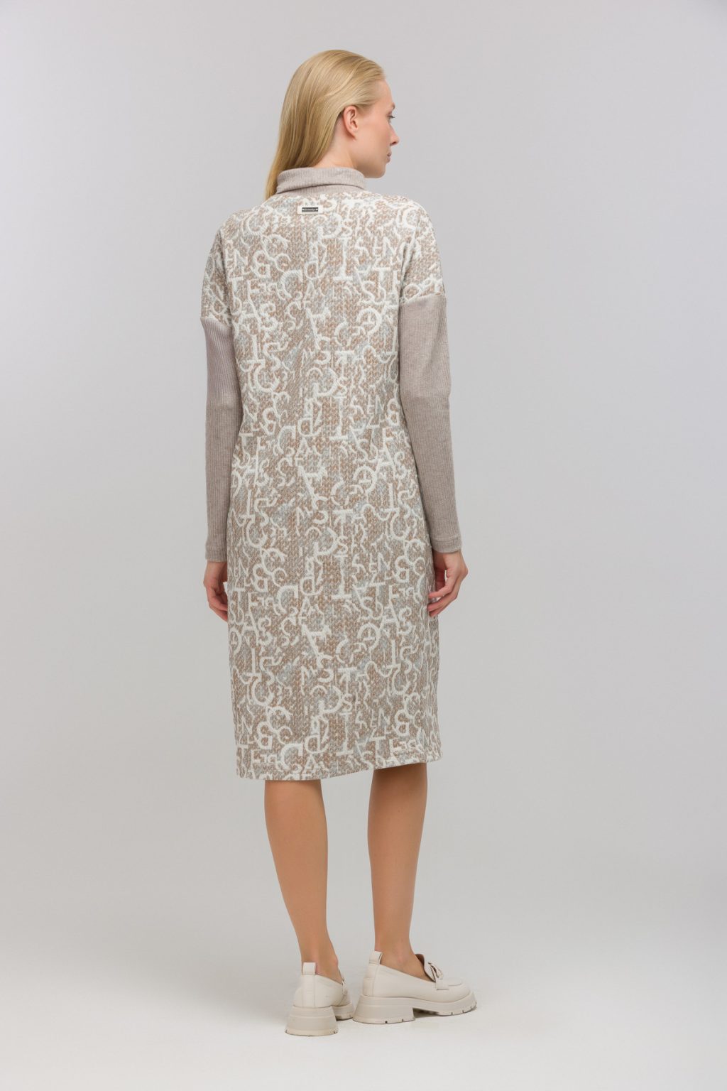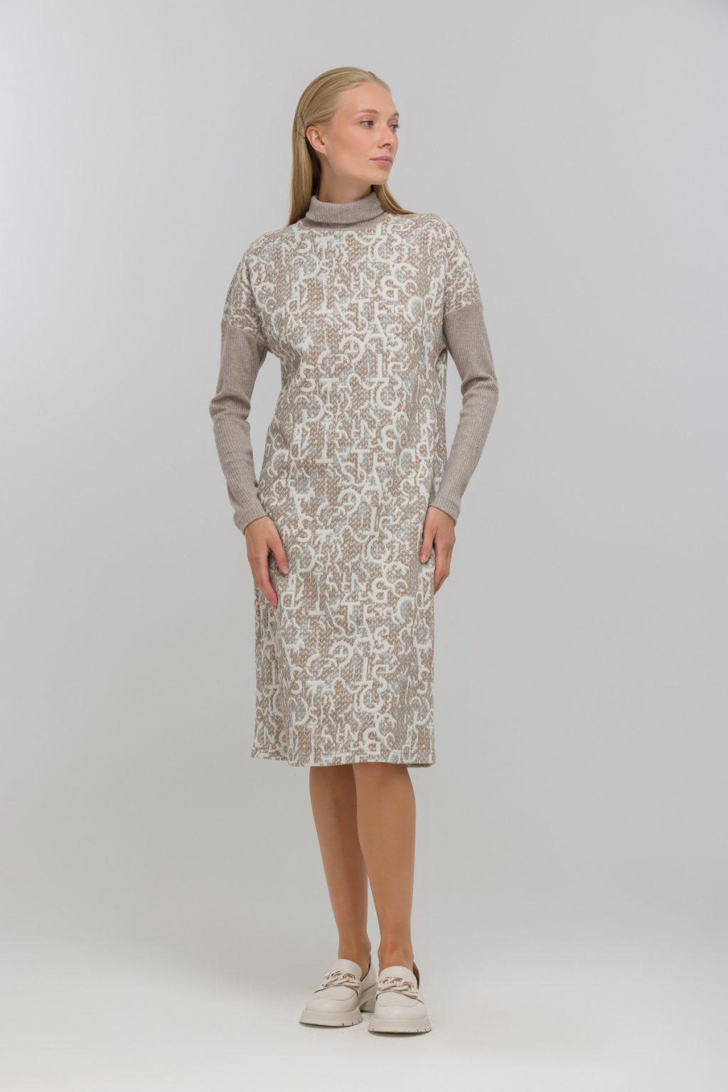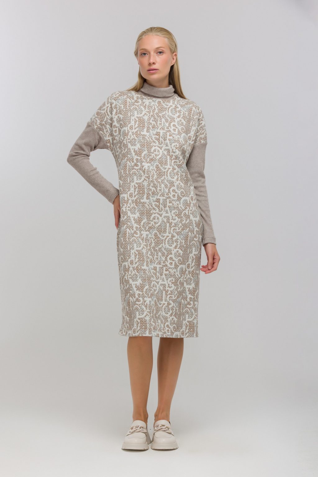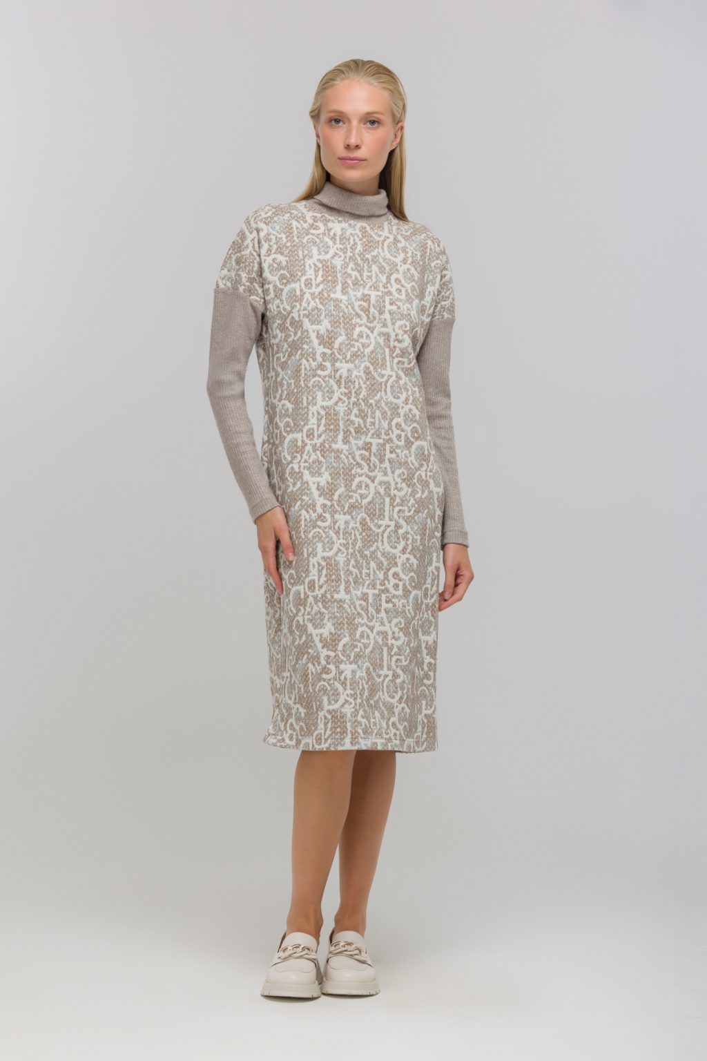 Трикотажное платье с фирменным принтом и контрастными рукавами в рубчик словно создано для тех, кто ценит в одежде не только комфорт, но и индивидуальность. В нем нет ничего лишнего: отсутствие застежек и подкладки делает каждое движение особенно свободным, а воротник-стойка добавляет образу сдержанной элегантности. Прямой силуэт и длина миди создают универсальную базу, которая легко вписывается в любой гардероб, а длинные рукава и спущенная линия плеча добавляют нотку непринужденности. Это платье отлично смотрится как на деловой встрече, так и на прогулке по городу, помогая чувствовать себя уверенно в любой ситуации. Легкий трикотаж приятно прилегает к телу, а фирменный принт сразу привлекает внимание, подчеркивая вашу индивидуальность. Контрастные рукава в рубчик становятся акцентом, который не только завершает образ, но и добавляет ему динамики. В таком платье легко оставаться собой и ловить на себе восхищенные взгляды.