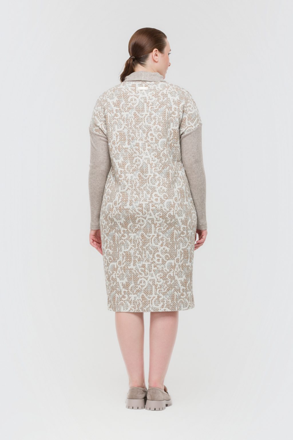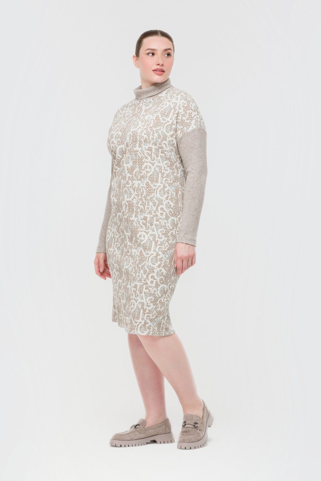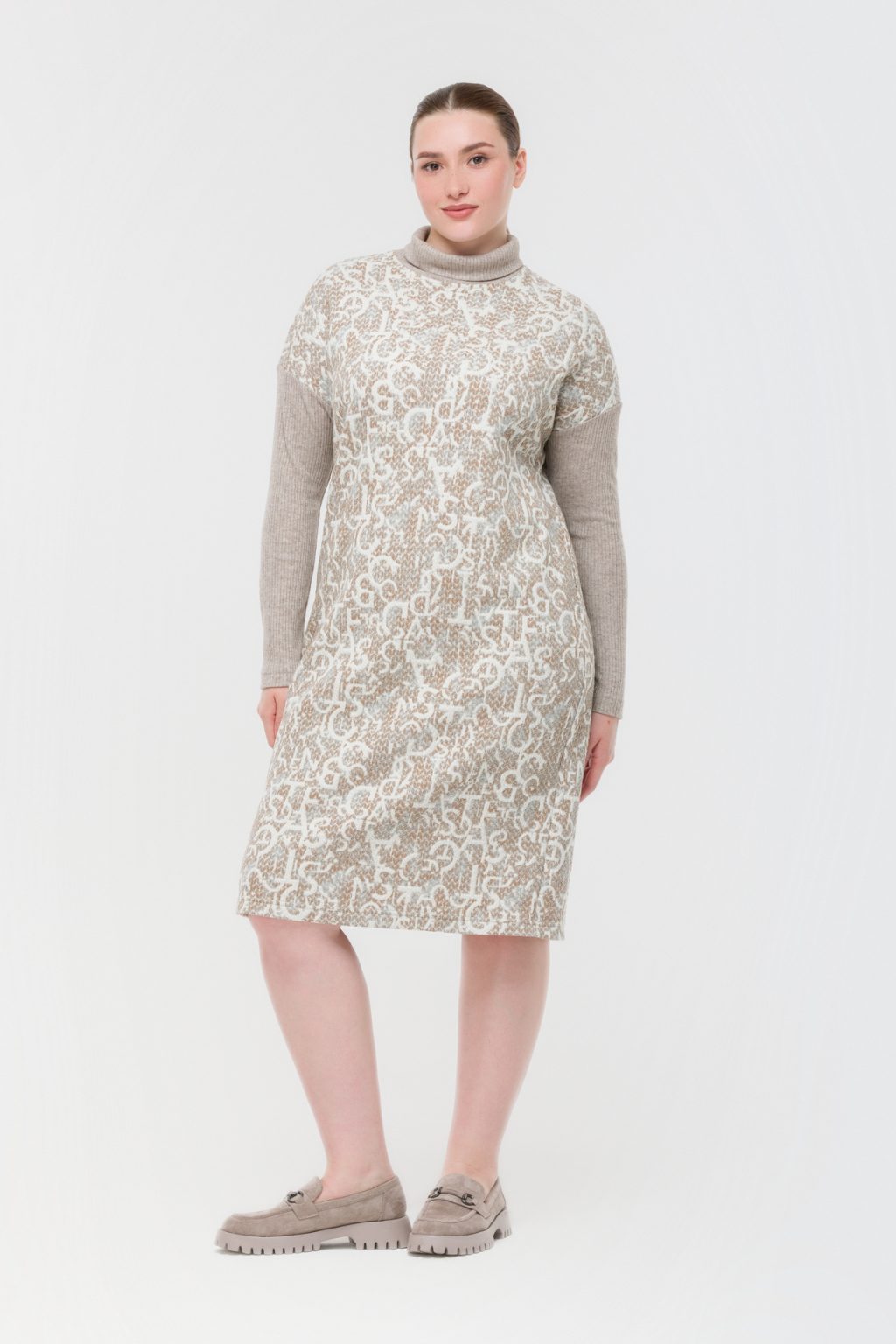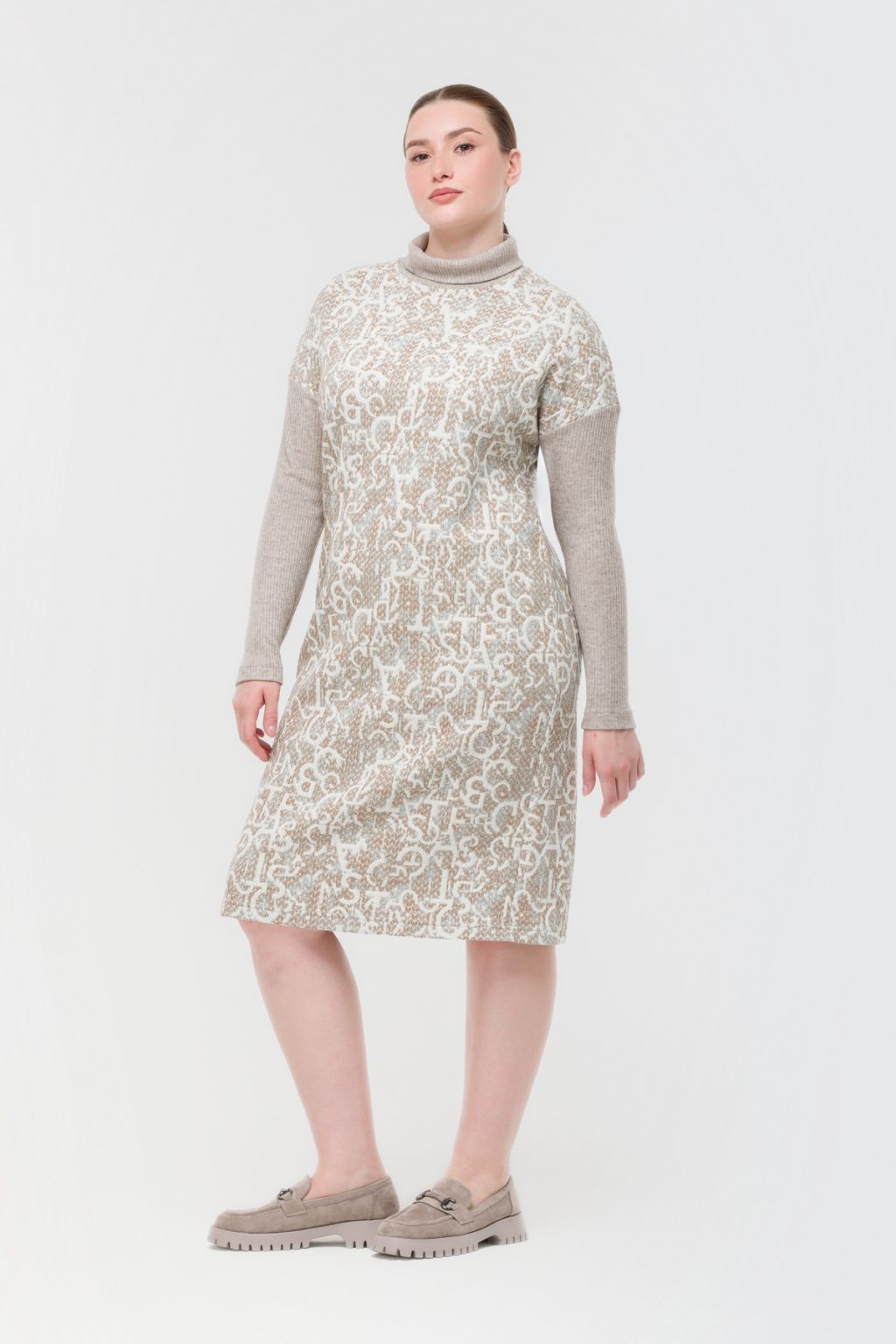 Трикотажное платье с фирменным принтом и контрастными рукавами в рубчик словно создано для тех, кто ценит в одежде не только комфорт, но и индивидуальность. В нем нет ничего лишнего: отсутствие застежек и подкладки делает каждое движение особенно свободным, а воротник-стойка добавляет образу сдержанной элегантности. Прямой силуэт и длина миди создают универсальную базу, которая легко вписывается в любой гардероб, а длинные рукава и спущенная линия плеча добавляют нотку непринужденности. Это платье отлично смотрится как на деловой встрече, так и на прогулке по городу, помогая чувствовать себя уверенно в любой ситуации. Легкий трикотаж приятно прилегает к телу, а фирменный принт сразу привлекает внимание, подчеркивая вашу индивидуальность. Контрастные рукава в рубчик становятся акцентом, который не только завершает образ, но и добавляет ему динамики. В таком платье легко оставаться собой и ловить на себе восхищенные взгляды.