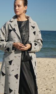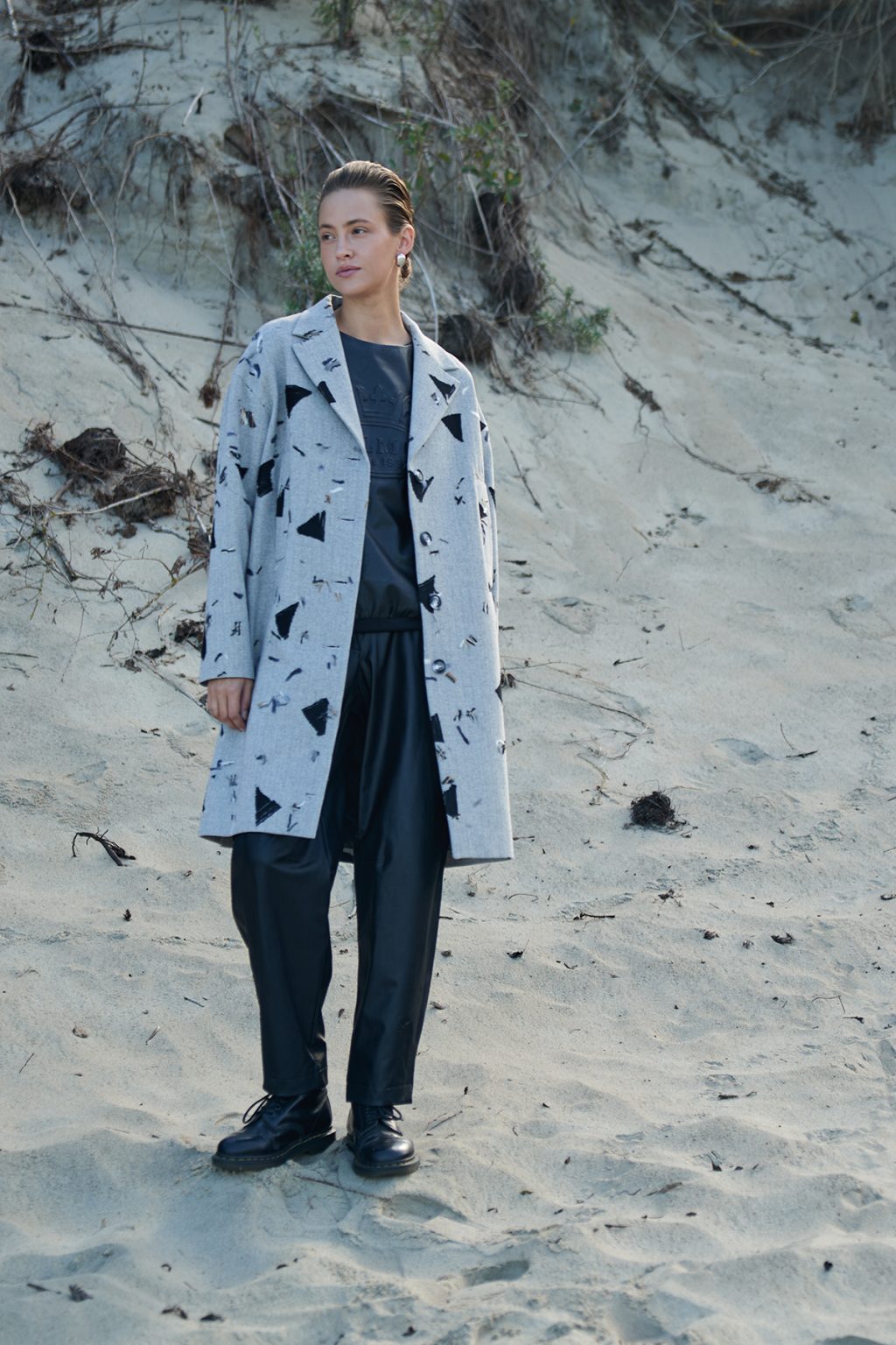 Однобортное пальто миди с английским воротником выполнено из плотной ткани с классическим орнаментом «ёлочка», дополненным объемным абстрактным рисунком, вплетенным в полотно. Модель отличается прямым свободным силуэтом и спущенной линией плеча, что придает образу современную расслабленность. Пальто застёгивается на пуговицы, оснащено подкладкой для дополнительного комфорта и не имеет подплечников, сохраняя естественную посадку. Два аккуратных прорезных кармана добавляют практичности, а разрез по заднему шву обеспечивает свободу движений. Универсальная длина миди и оригинальная фактура делают это пальто стильным акцентом как для повседневных, так и для более элегантных образов с брюками, джинсами или юбками.
