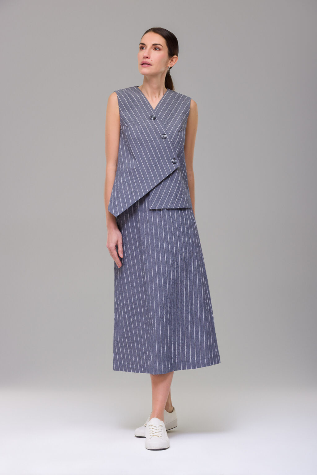 Юбка длины миди из жатой хлопковой ткани в полоску.