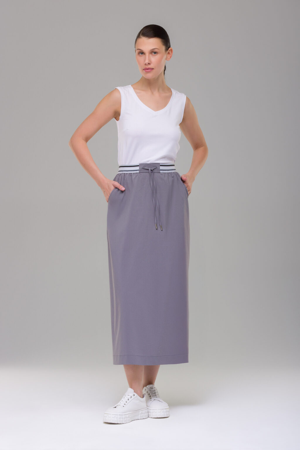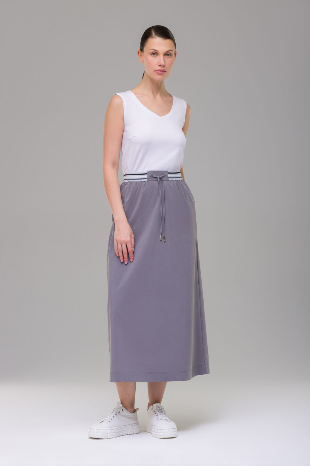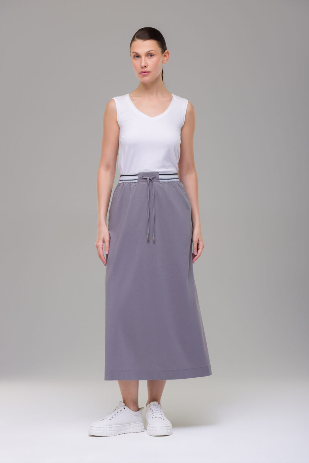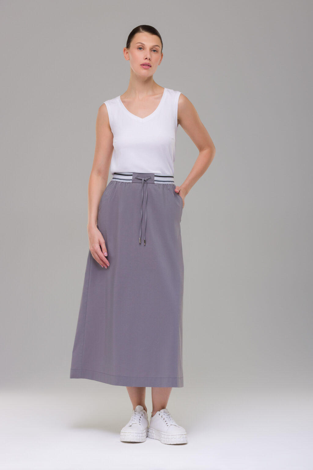 Эластичный пояс на резинке обеспечивает комфортную посадку по талии, надёжно удерживая юбку в процессе носки. Макси-длина создаёт изящный, женственный силуэт, визуально удлиняя ноги и подчёркивая стройность фигуры. Силуэт-трапеция добавляет модели непринуждённости, не сковывая движений — юбка одинаково удобна как для неспешных прогулок, так и для активного дня.