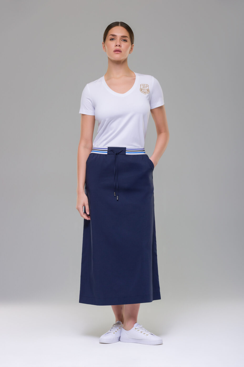Эластичный пояс на резинке обеспечивает комфортную посадку по талии, надёжно удерживая юбку в процессе носки. Макси-длина создаёт изящный, женственный силуэт, визуально удлиняя ноги и подчёркивая стройность фигуры. Силуэт-трапеция добавляет модели непринуждённости, не сковывая движений — юбка одинаково удобна как для неспешных прогулок, так и для активного дня.