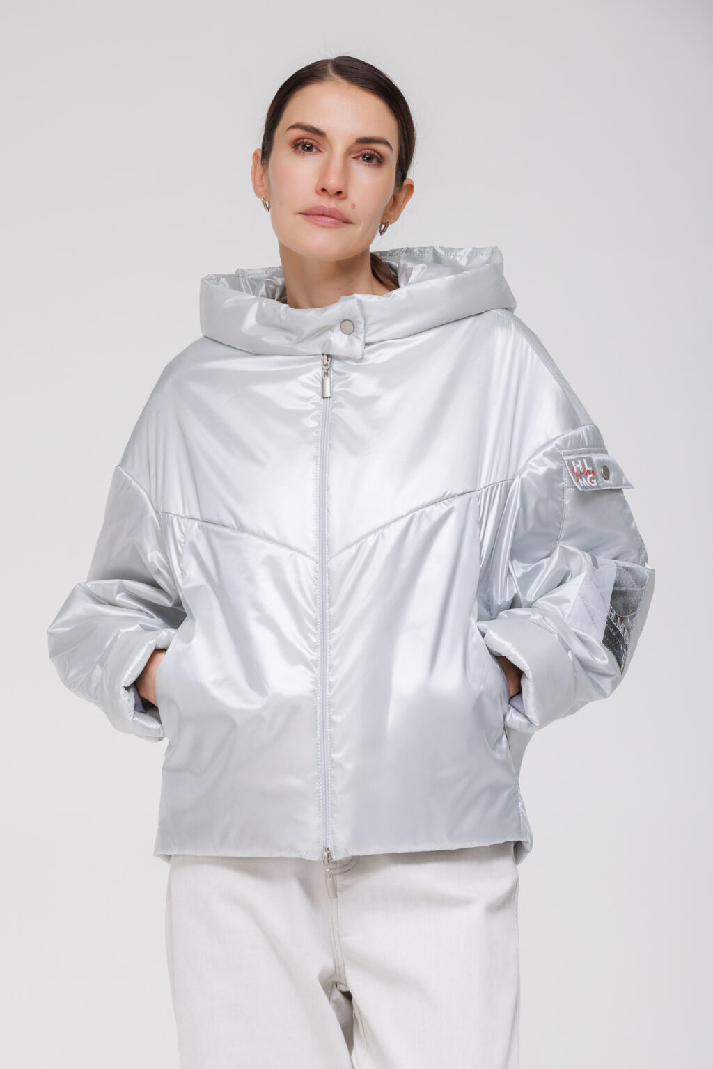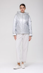 Практичность модели подчёркивают функциональные карманы: два по боковым швам для хранения необходимых мелочей и дополнительный карман на рукаве на кнопке — удобное решение для хранения небольших предметов, таких как ключи или проездной билет. Жемчужные переливы ткани придают изделию изысканный внешний вид, делая куртку заметным элементом гардероба.