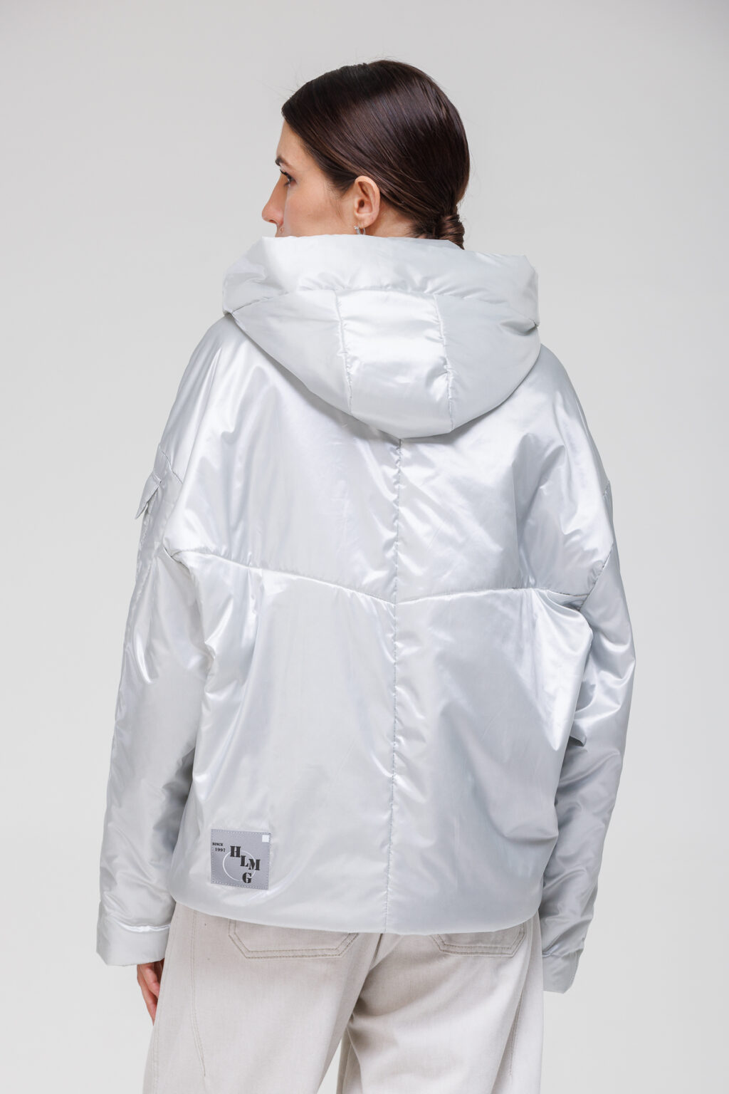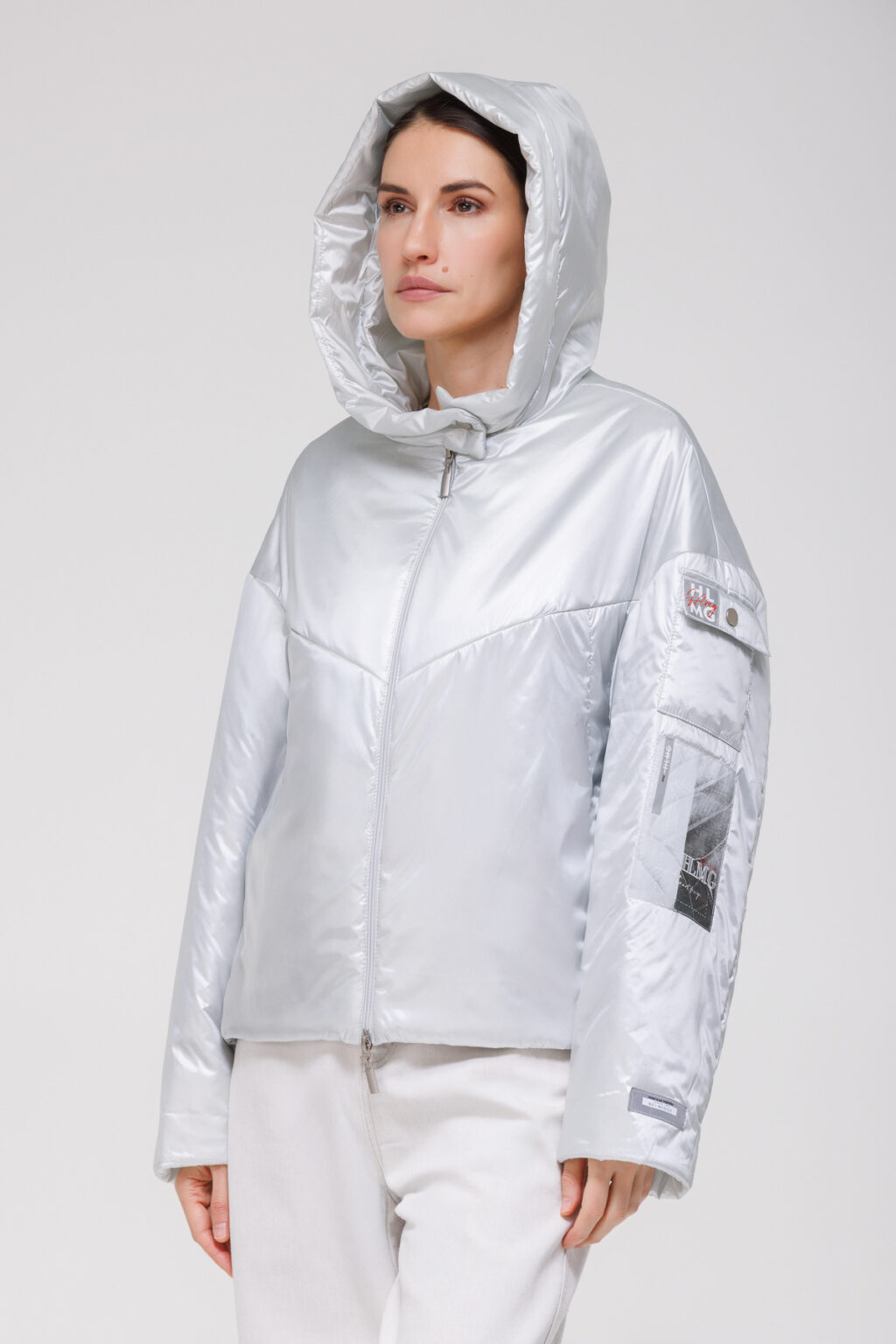 Свободный крой в сочетании со спущенной линией плеча создаёт непринуждённую посадку, не сковывая движений и позволяя комбинировать куртку с объёмными слоями одежды. Рукава типа «летучая мышь» придают модели современный силуэт и добавляют комфорта при активных перемещениях. Несъёмный капюшон на кнопке защищает от ветра и осадков, а кулиска по низу позволяет регулировать объём, обеспечивая дополнительную защиту от холода.