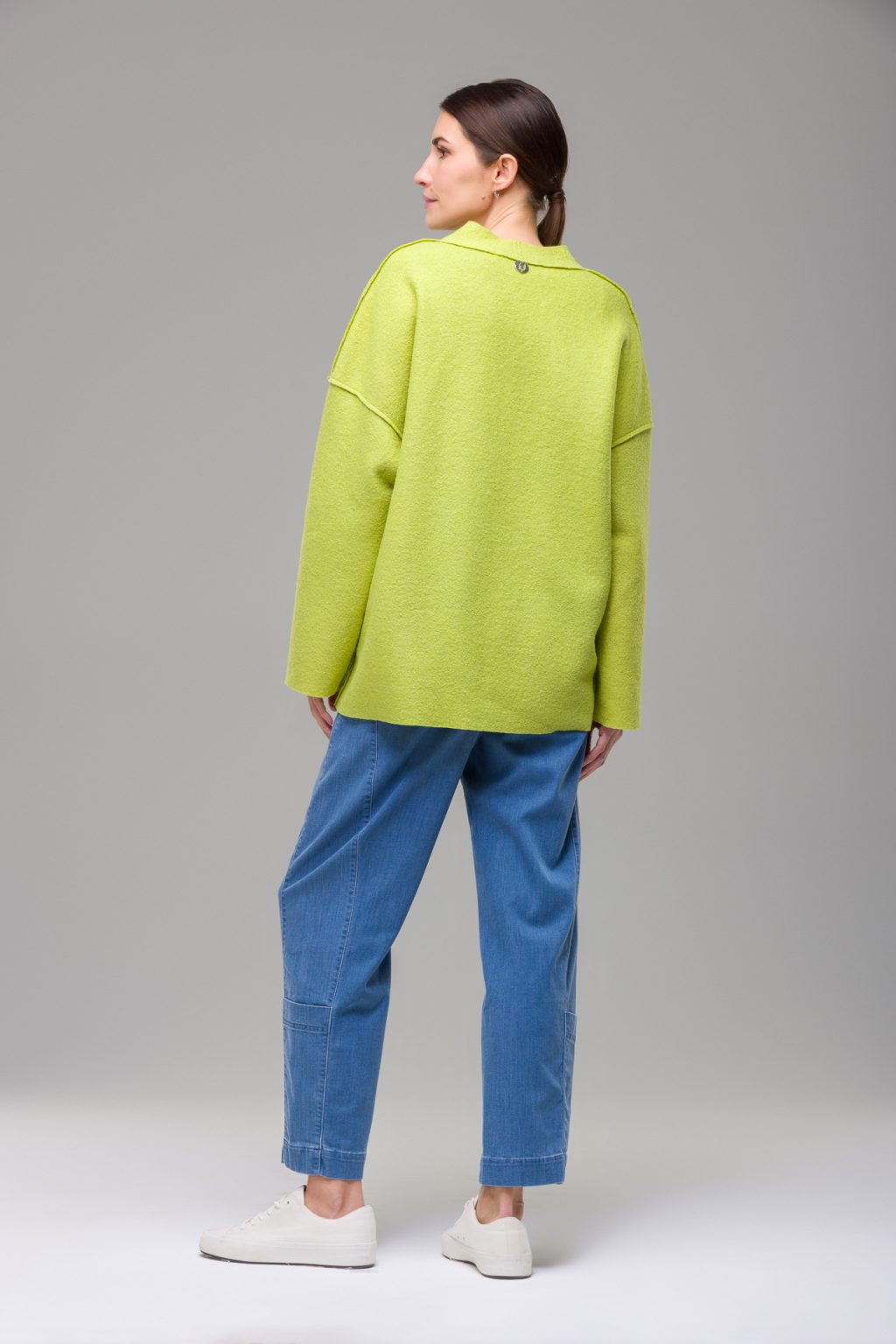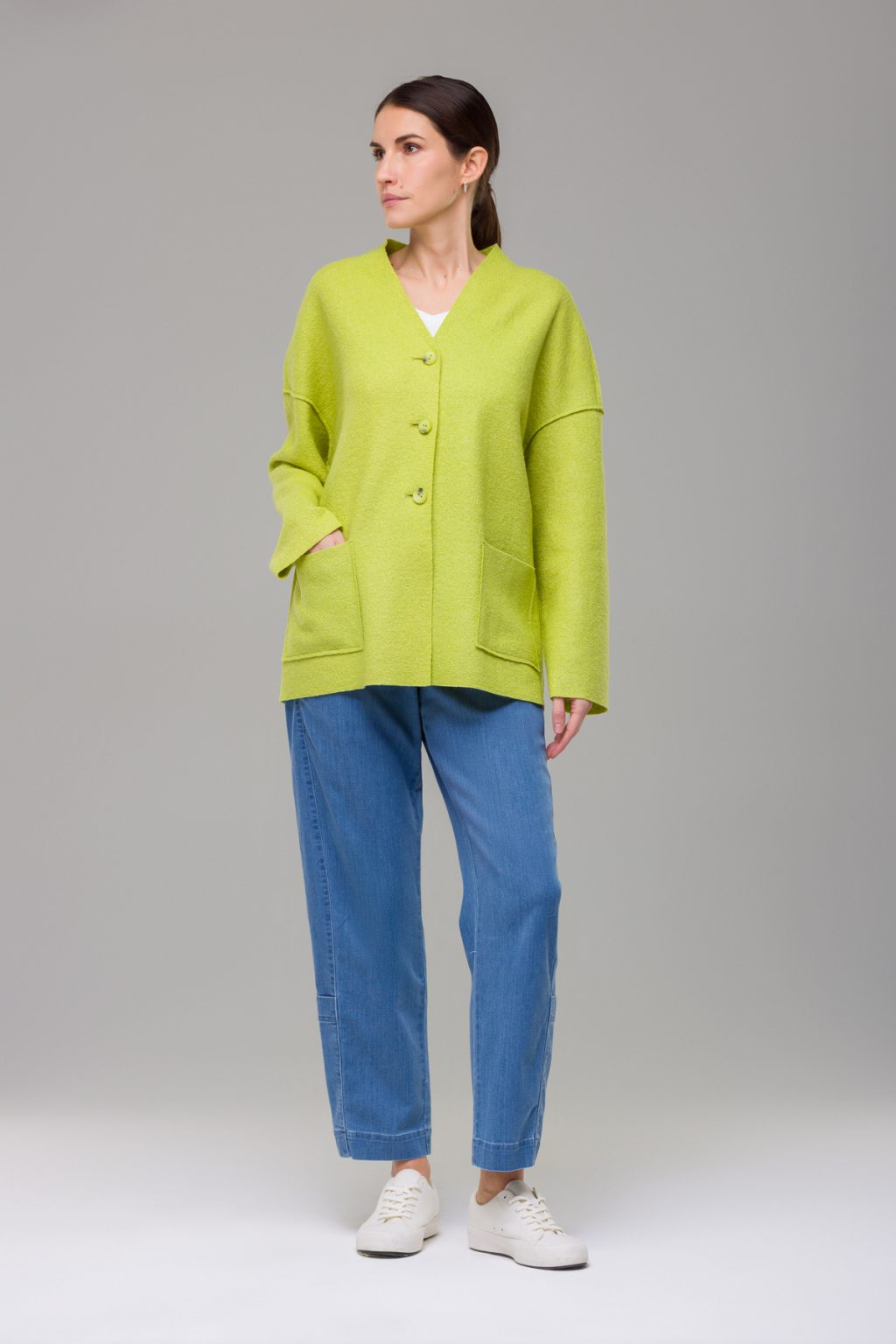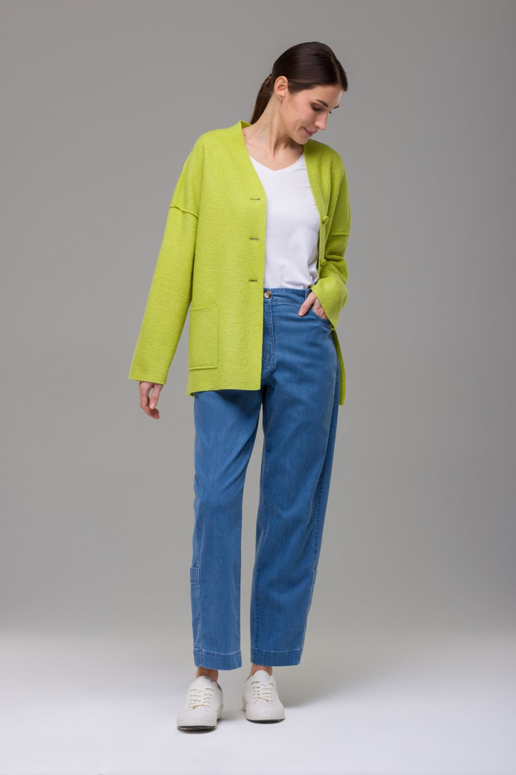 Свободный крой в сочетании с прямым силуэтом создаёт непринуждённую посадку, не сковывая движений и позволяя комбинировать жакет с различными элементами гардероба. Спущенная линия плеча визуально смягчает силуэт, придавая образу расслабленную утончённость. Длинные рукава обеспечивают комфорт в прохладную погоду, а два накладных кармана выполняют практическую функцию, позволяя хранить мелкие предметы без необходимости брать с собой сумку. Отсутствие воротника придаёт модели минималистичный характер, делая её универсальным решением для разнообразных стилистических сочетаний.
