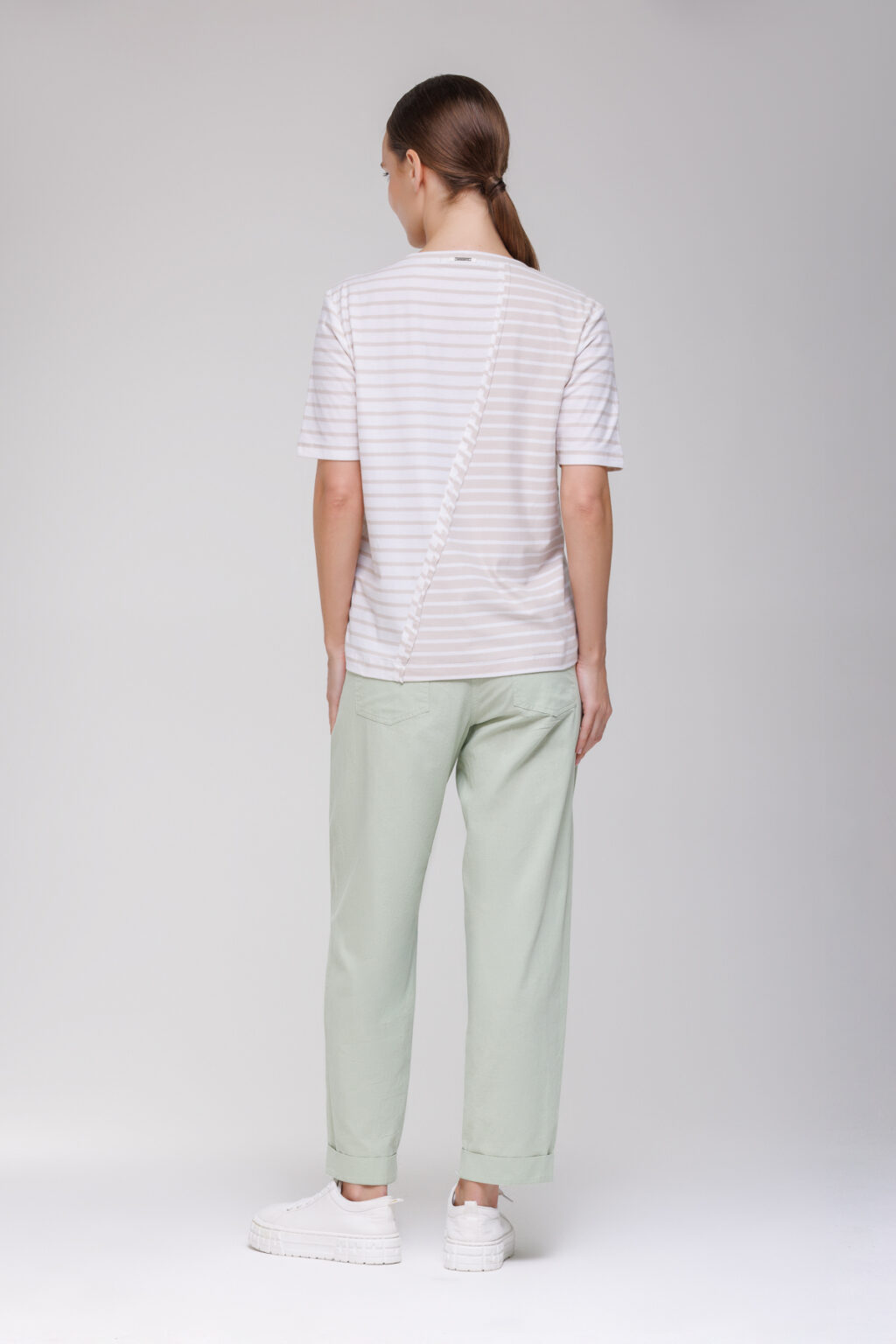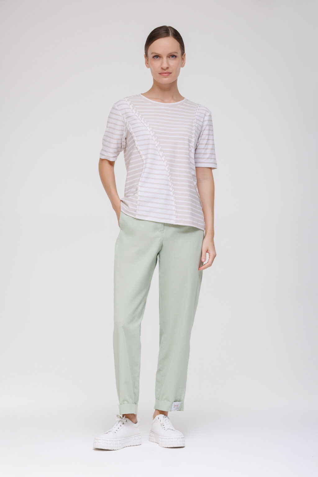Пояс на резинке придаёт модели дополнительную эргономичность, обеспечивая комфортную посадку и свободу движений в течение всего дня. Средняя посадка на талии подчёркивает естественные пропорции силуэта, создавая сбалансированный и аккуратный внешний вид без излишней строгости.