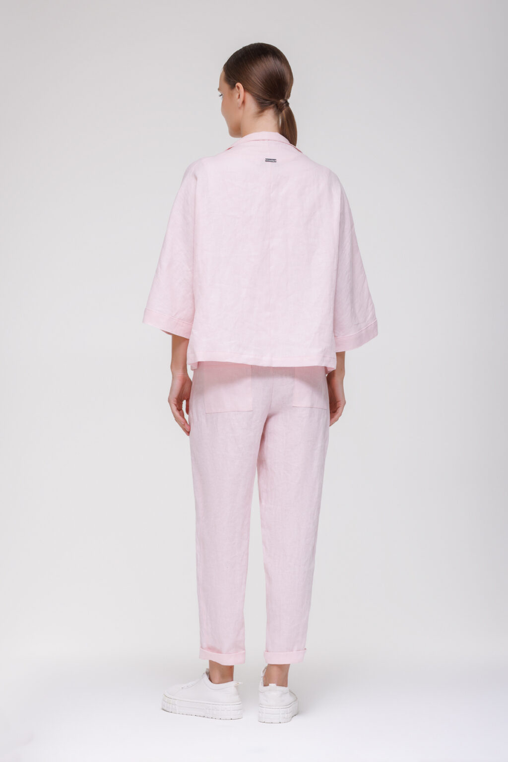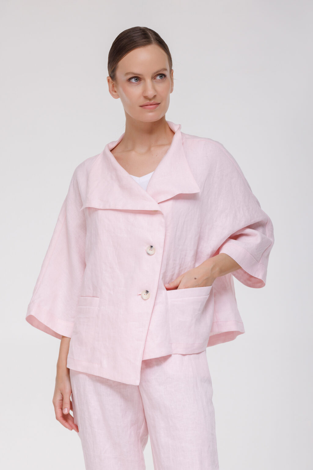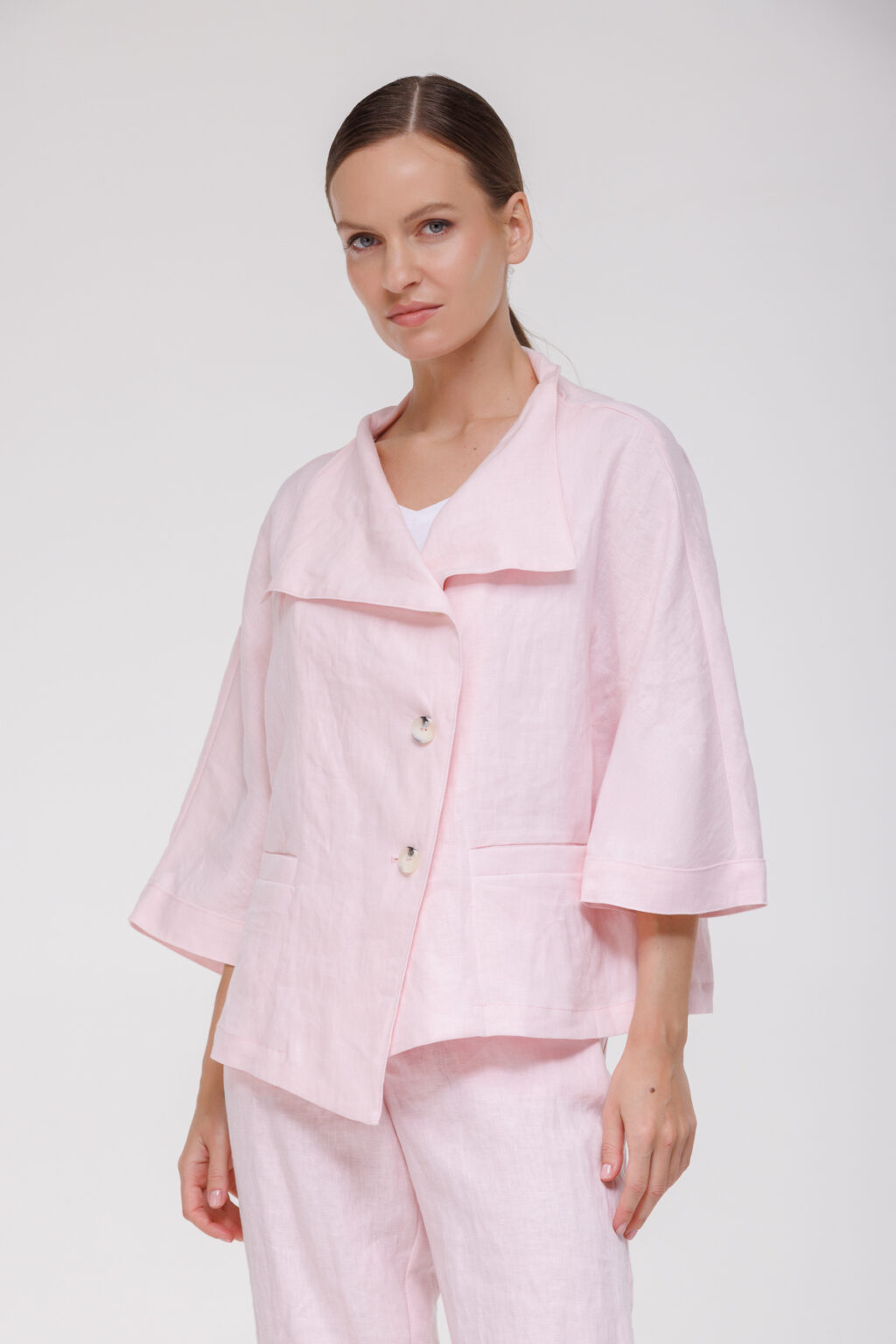 Укороченный жакет с воротником апаш из льна представляет собой стильное и функциональное дополнение к летнему и демисезонному гардеробу, сочетая натуральные материалы с современным кроем. Застёжка на пуговицы обеспечивает удобство эксплуатации и придаёт изделию аккуратный, структурированный вид, позволяя регулировать степень прилегания в зависимости от образа.