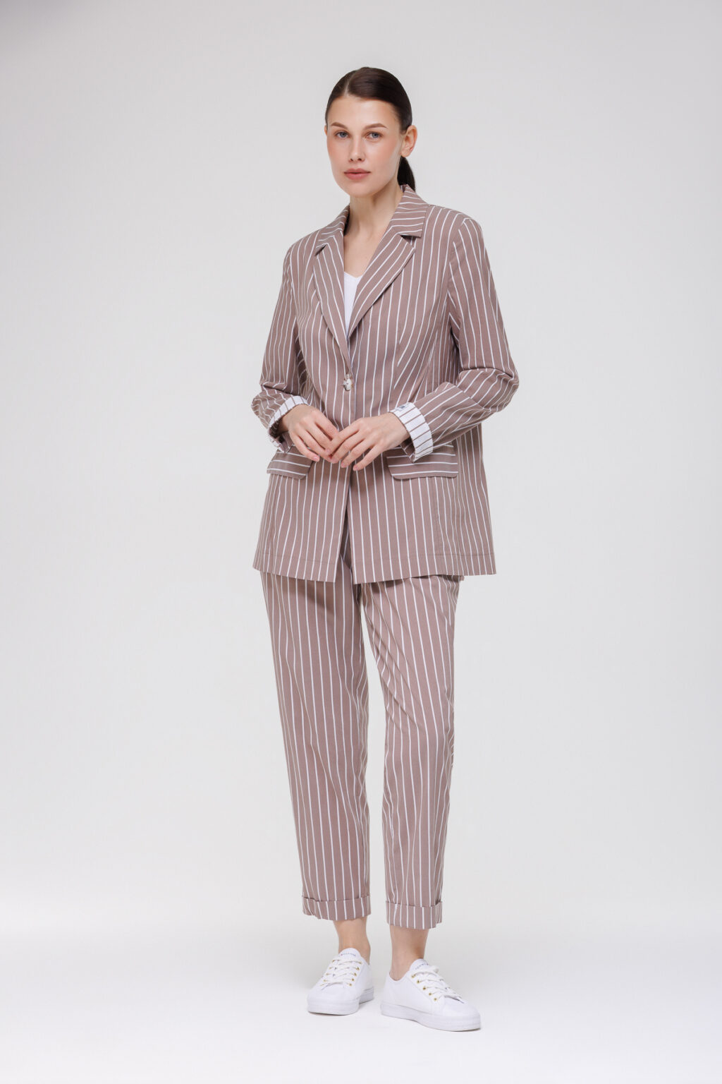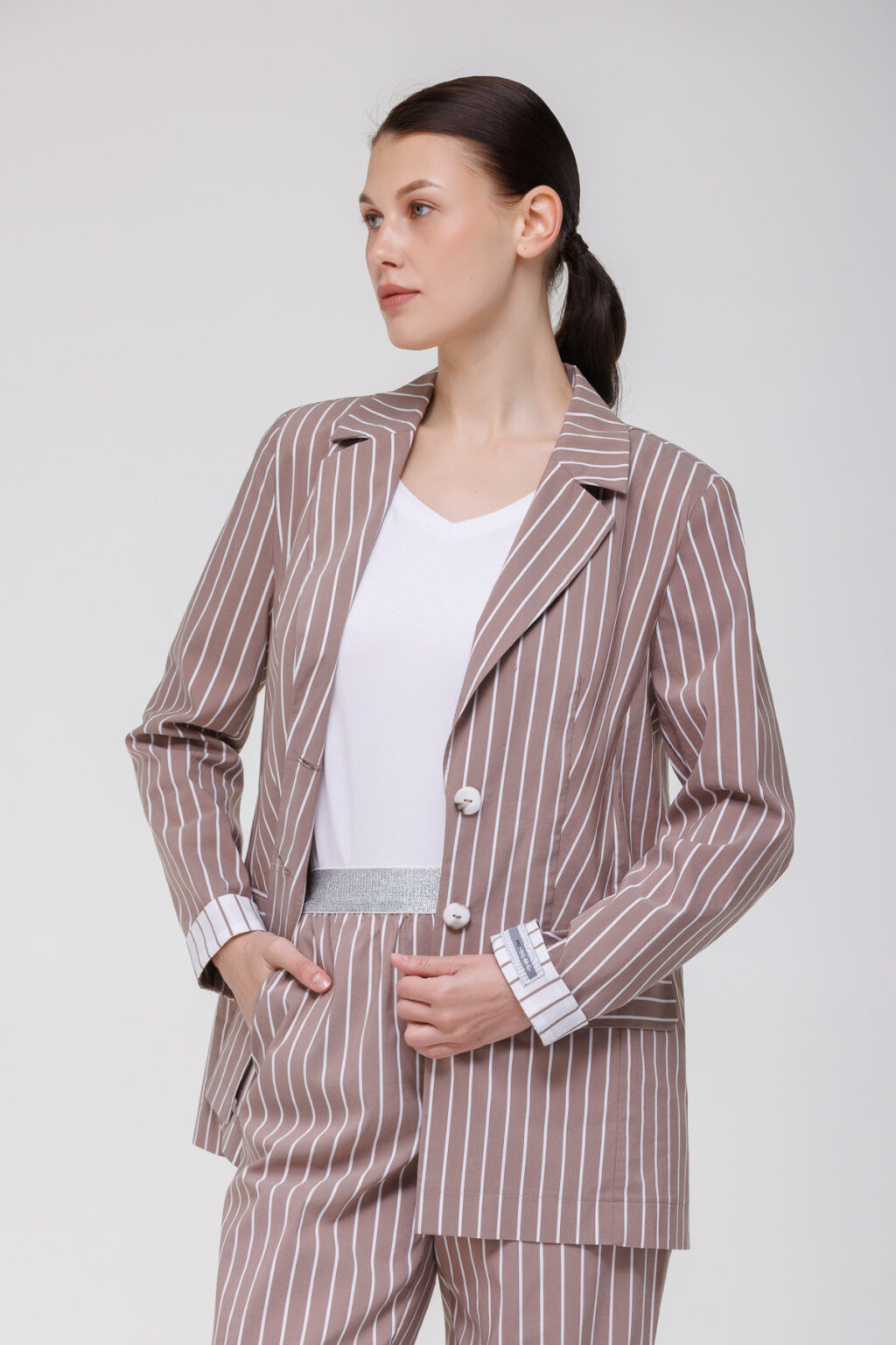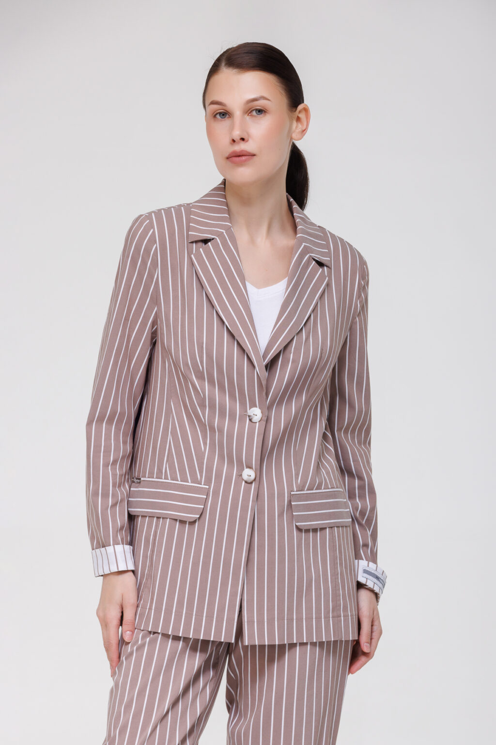 Прямой жакет в полоску из смесовой ткани на основе хлопка воплощает классический подход к деловому гардеробу, сочетая традиции кроя с современными материалами и деталями. Модель выполнена из смесовой ткани с преобладанием хлопка — материал обеспечивает хорошую воздухопроницаемость, отличается износостойкостью и сохраняет форму в течение дня, при этом оставаясь комфортным в носке.