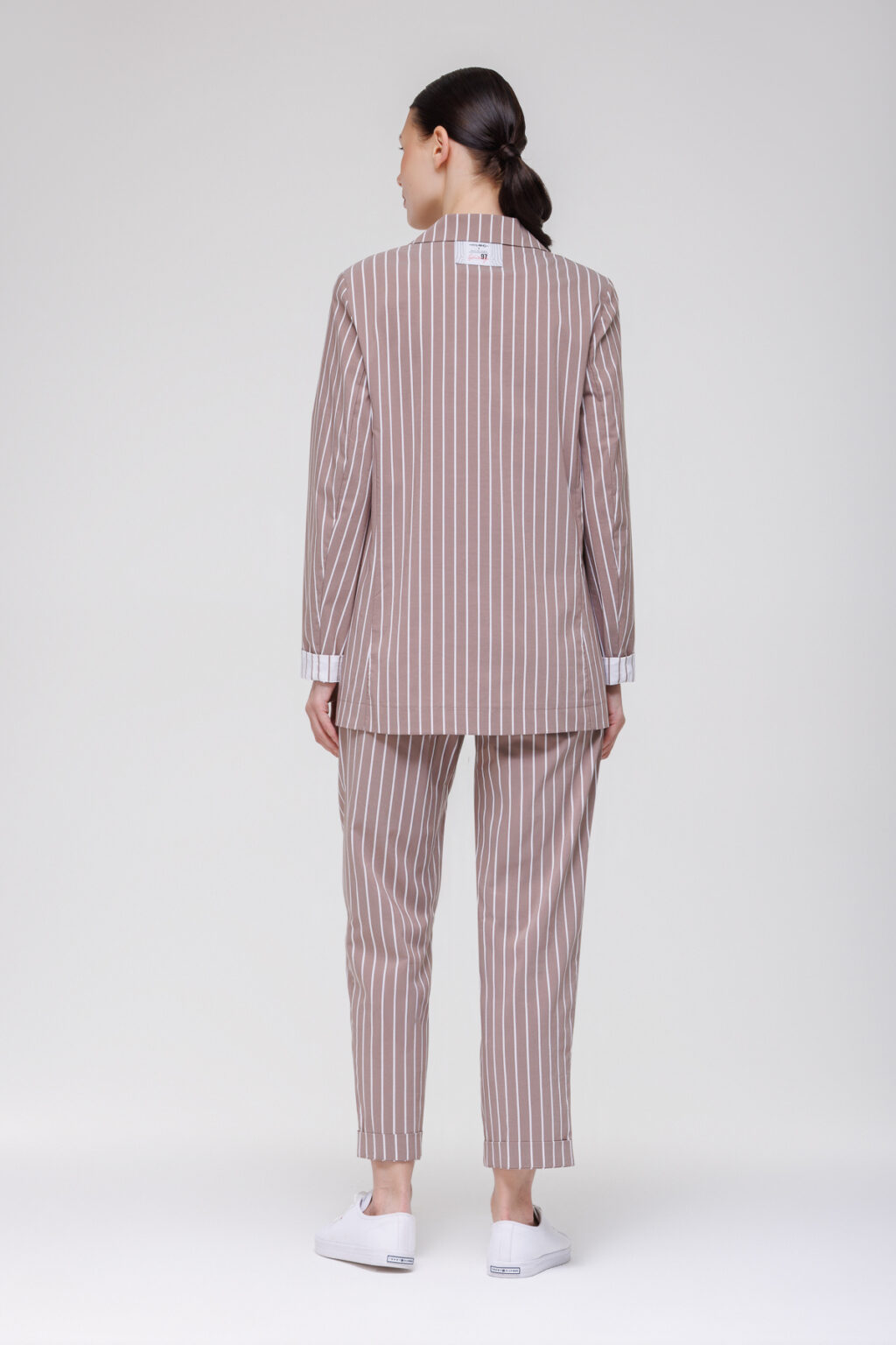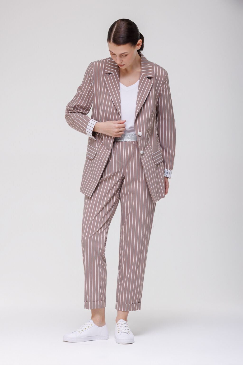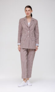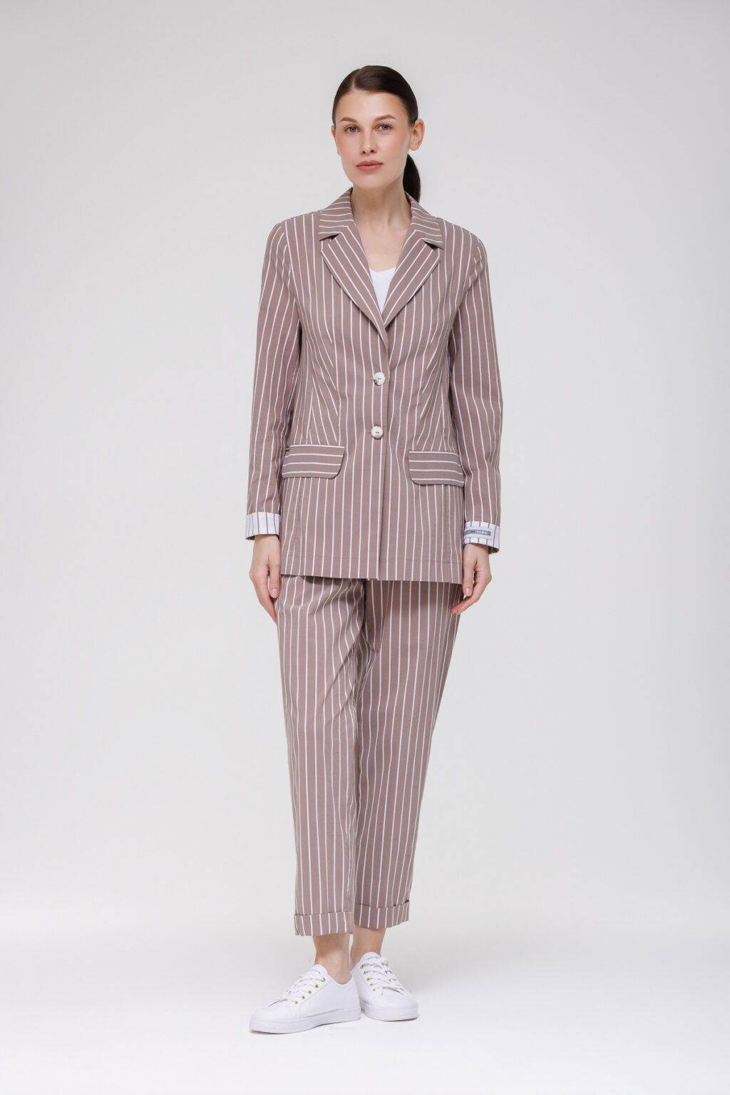 Прямой жакет в полоску из смесовой ткани на основе хлопка воплощает классический подход к деловому гардеробу, сочетая традиции кроя с современными материалами и деталями. Модель выполнена из смесовой ткани с преобладанием хлопка — материал обеспечивает хорошую воздухопроницаемость, отличается износостойкостью и сохраняет форму в течение дня, при этом оставаясь комфортным в носке.