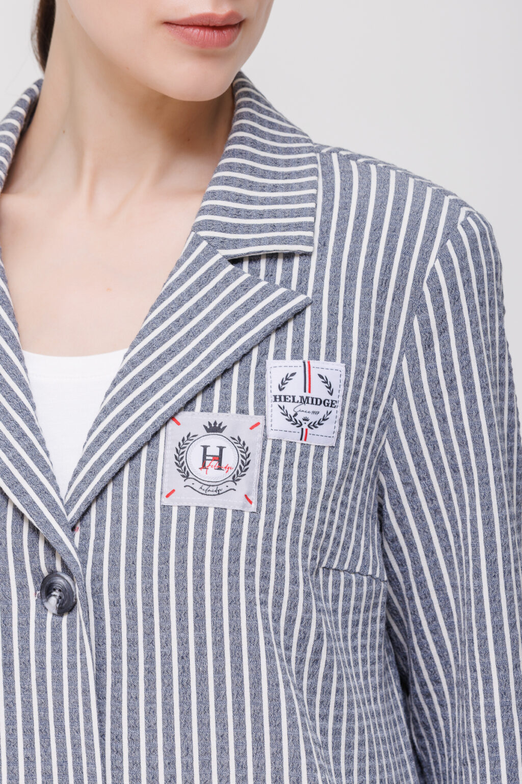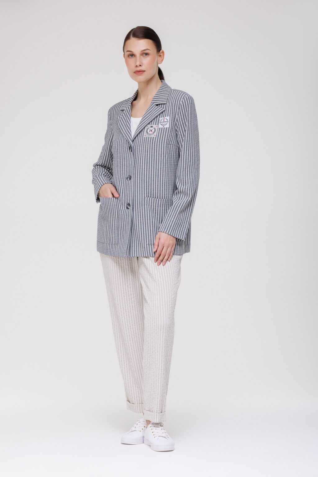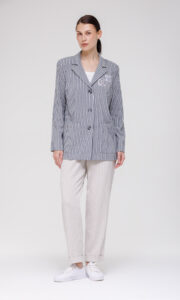 Наличие подплечников поддерживает правильную форму изделия, сохраняет линию плеч и помогает поддерживать безупречный силуэт в течение всего дня. Длинные рукава обеспечивают комфорт в прохладную погоду и позволяют легко комбинировать жакет с различными топами и блузами. Английский воротник придаёт модели респектабельный облик, подчёркивая линию шеи и добавляя образу формальности. Два накладных кармана выполняют практическую функцию — в них можно разместить мелкие предметы, — и одновременно вносят в дизайн элемент утилитарной эстетики, не нарушая общей строгости силуэта. Полосатый принт структурирует образ, визуально корректирует пропорции и остаётся актуальным вне сезонных трендов.