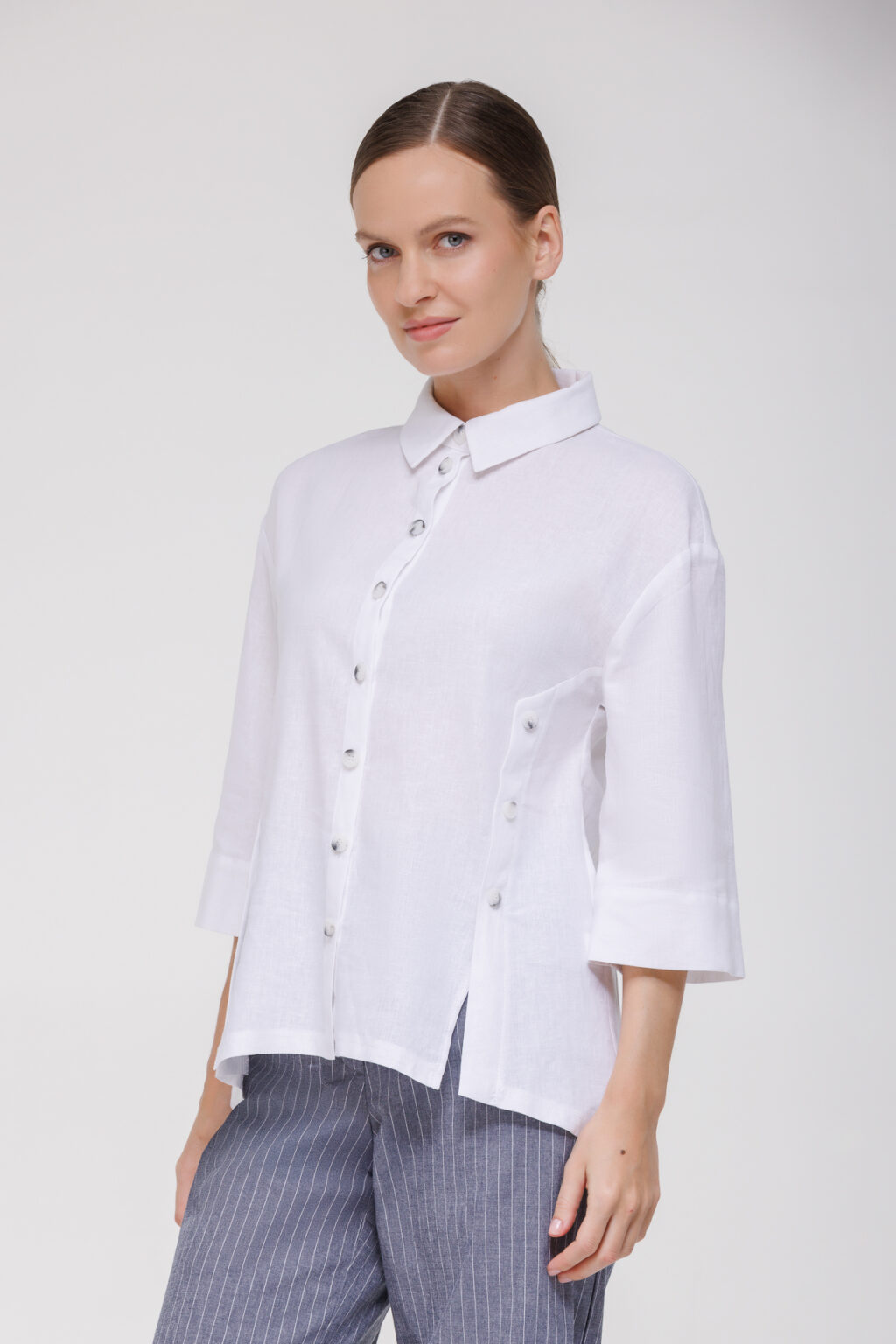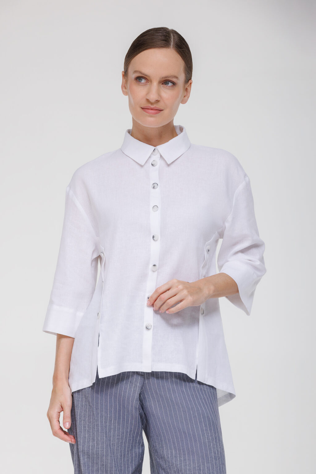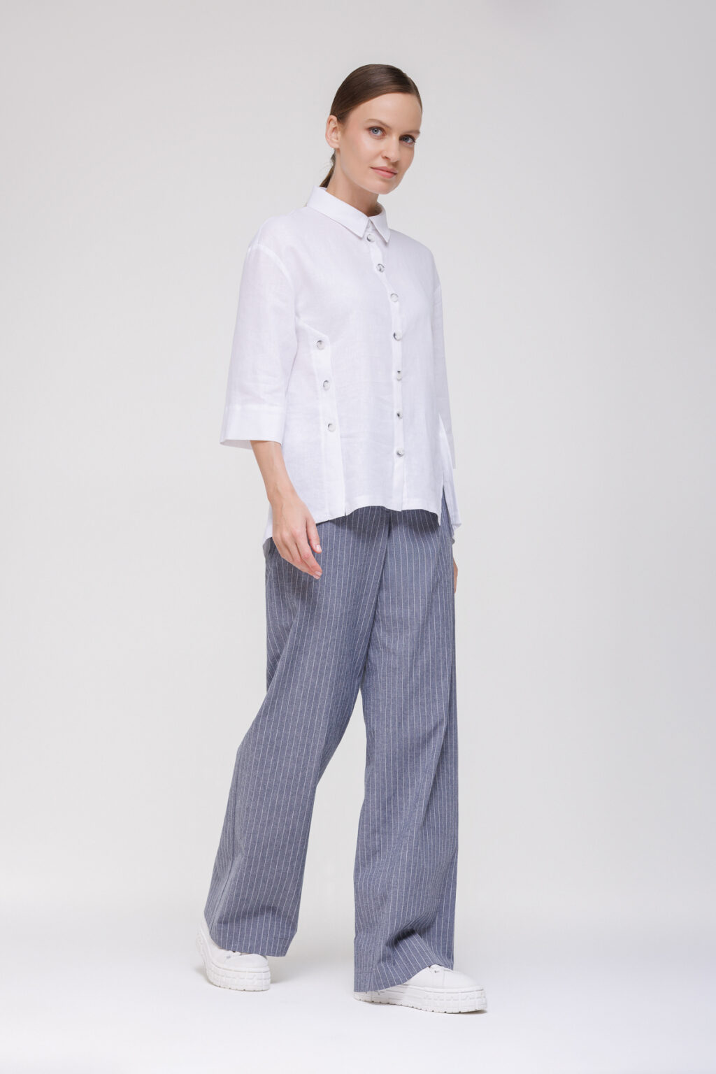 Рубашка из смесового материала на основе льна и вискозы с декоративными пуговицами воплощает идею лёгкости и комфорта, дополненную утончёнными дизайнерскими деталями, которые придают образу индивидуальность. Модель выполнена из смесовой ткани с преобладанием льна и вискозы — материал отличается высокой воздухопроницаемостью, приятной текстурой и способностью сохранять форму, обеспечивая комфорт в тёплую погоду и не требуя сложного ухода.