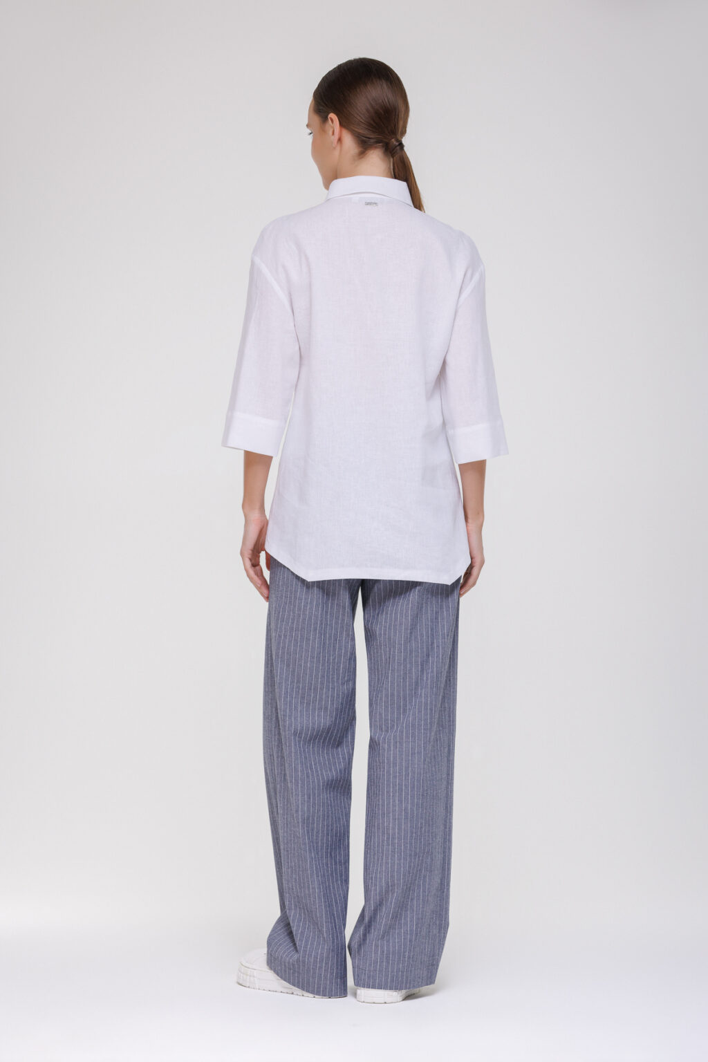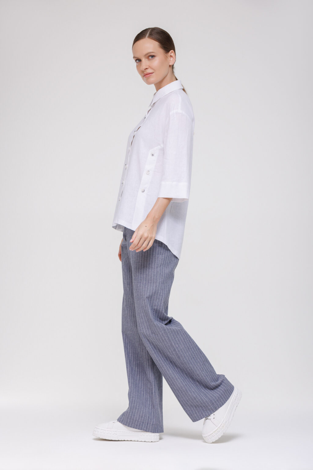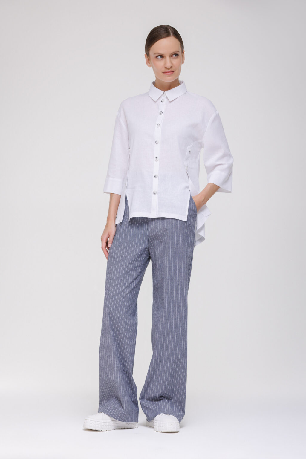 Рубашка из смесового материала на основе льна и вискозы с декоративными пуговицами воплощает идею лёгкости и комфорта, дополненную утончёнными дизайнерскими деталями, которые придают образу индивидуальность. Модель выполнена из смесовой ткани с преобладанием льна и вискозы — материал отличается высокой воздухопроницаемостью, приятной текстурой и способностью сохранять форму, обеспечивая комфорт в тёплую погоду и не требуя сложного ухода.