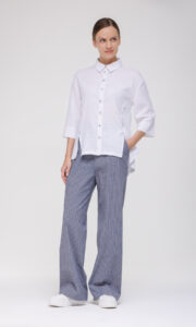 Рубашка органично впишется в повседневный и деловой гардероб. Её можно надеть в офис с неформальным дресс‑кодом в сочетании с классическими брюками или юбкой‑карандаш, использовать в городских образах с джинсами и шортами или включить в летние комплекты с льняными брюками и сандалиями. Модель гармонично сочетается с разной обувью — от лоферов и туфель‑оксфордов до кроссовок, позволяя создавать сбалансированные ансамбли.